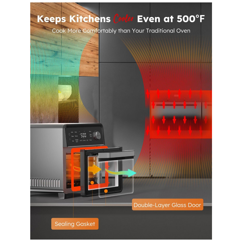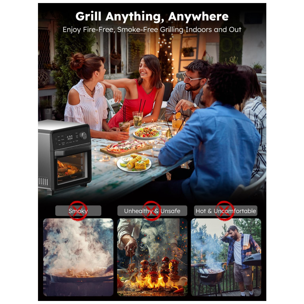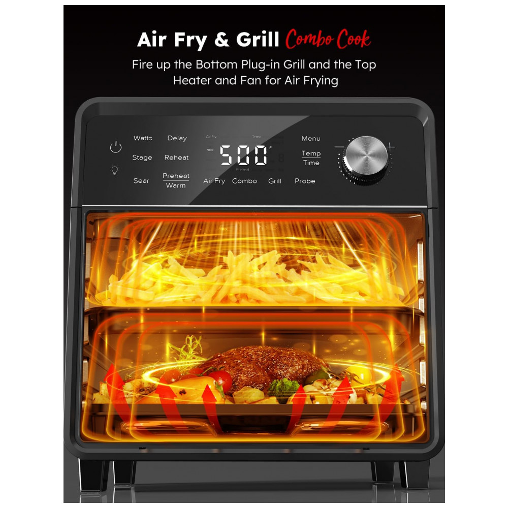 O Nuwave Pro-Smart Grill & Air Fryer Oven é um forno elétrico multifuncional com capacidade aproximada de 15,5 litros, projetado para air fryer, grelhados, assados e tostagem em um único equipamento de bancada. O sistema de convecção aprimorado de 2024 utiliza circulação de ar quente em alta velocidade combinada com resistências superiores para distribuir o calor de forma mais uniforme no interior da câmara. A porta em vidro temperado de dupla camada com vedação contribui para retenção térmica, melhor eficiência energética e menor transferência de calor para o ambiente.