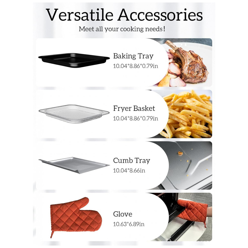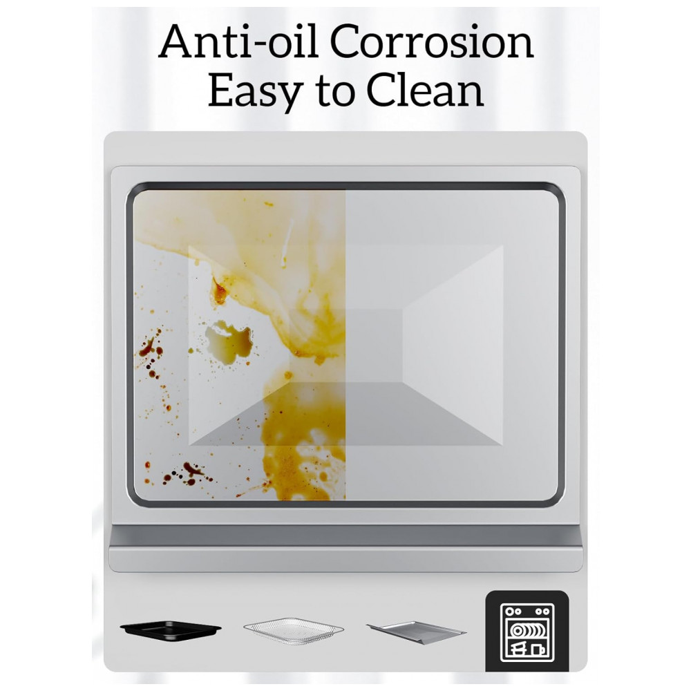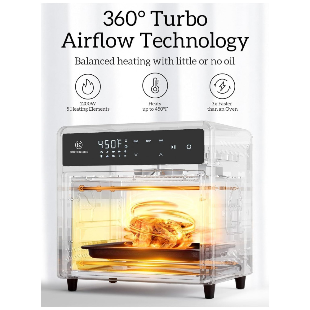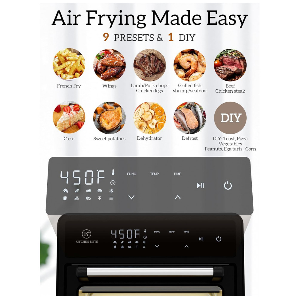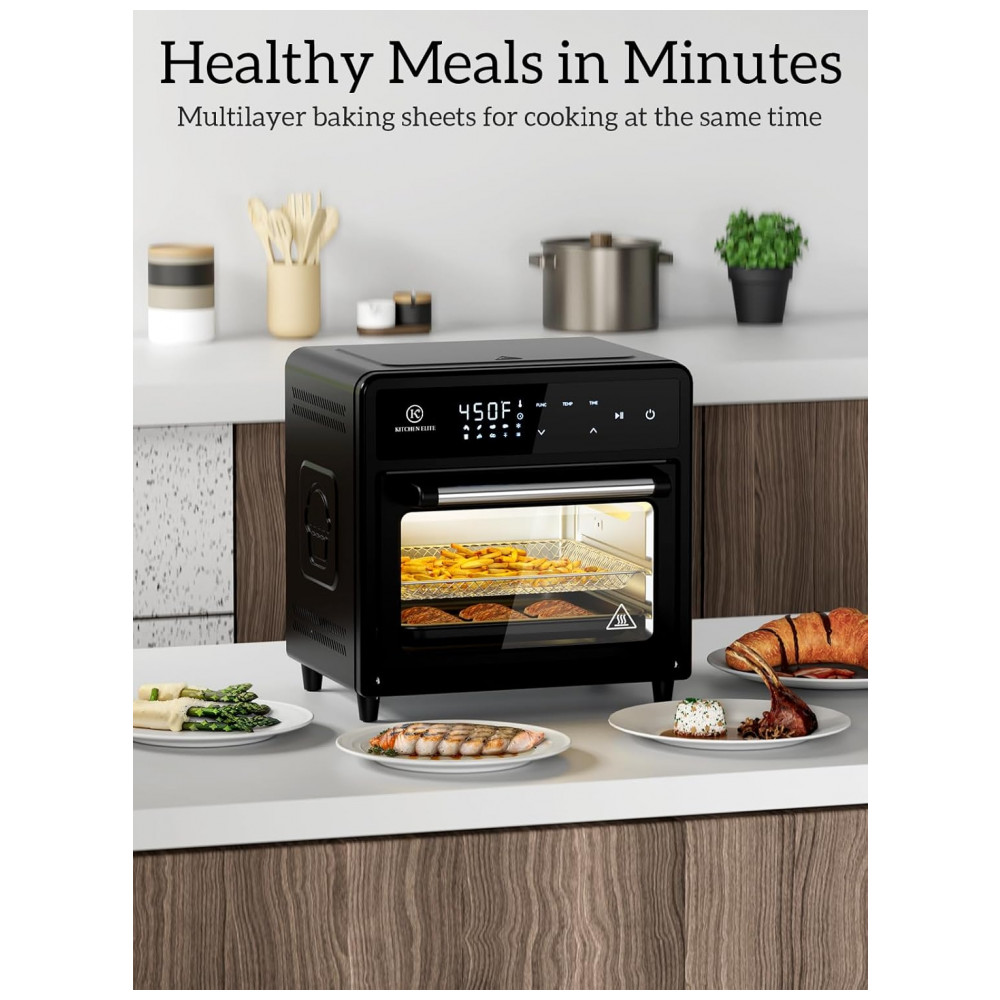 O Kitchen Elite AFO-101-BK-AMZ é um forno elétrico de bancada tipo air fryer toaster oven combo, com capacidade aproximada de 12 litros (12,6QT), indicado para assar, grelhar, reaquecer, desidratar e fritar com ar em porções familiares. A estrutura externa e a cavidade são em aço inoxidável, o que facilita a limpeza por simples passagem de pano úmido. O aparelho acompanha uma luva térmica para manuseio mais seguro de assadeiras e grelhas quentes durante o uso.
