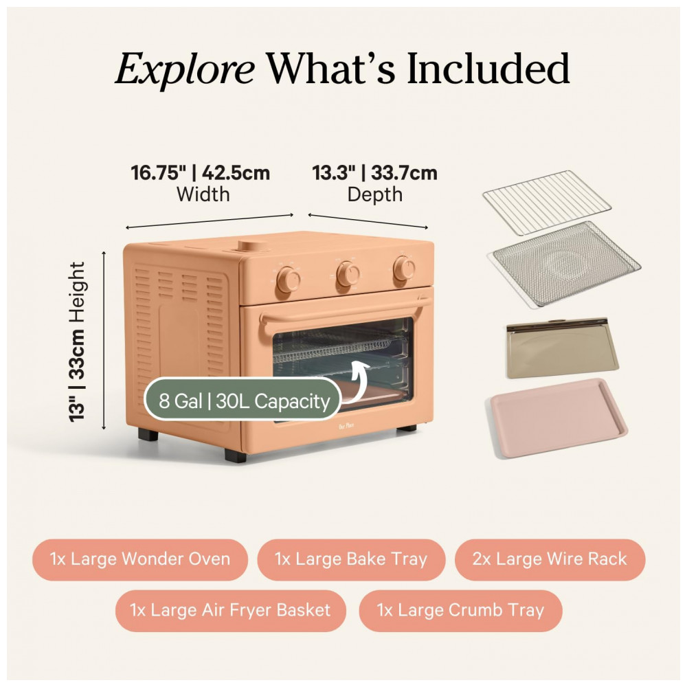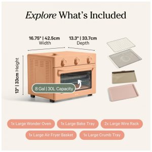 O Forno Elétrico Our Place Wonder Oven Pro 30 litros oferece 8 funções versáteis: air fryer, assar, tostar, grelhar, aquecer, descongelar, desidratar e prova de fermentação. Com design compacto e capacidade ampliada, acomoda pizzas de até 30 cm e frangos inteiros, ideal para famílias e pequenos grupos.