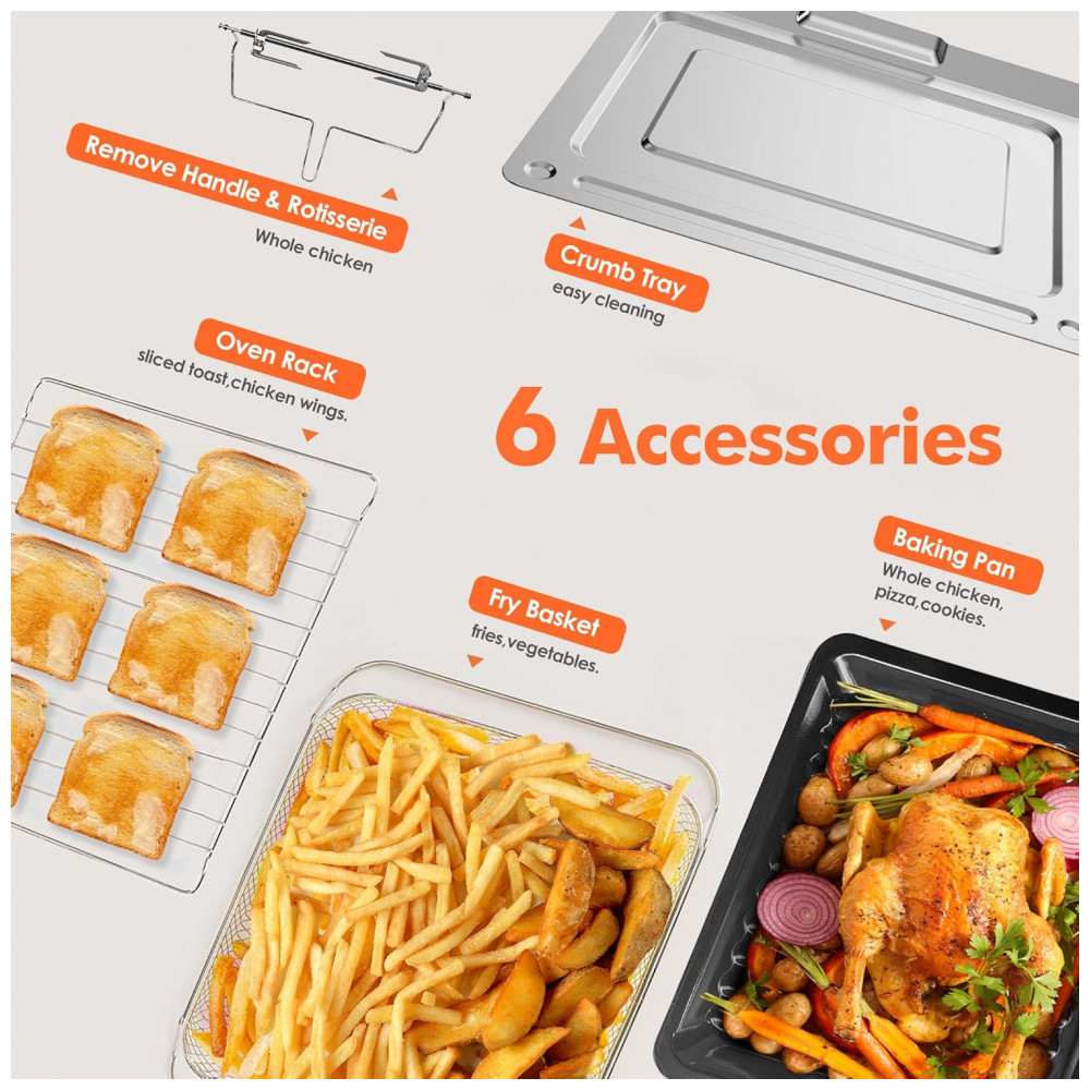 Acessórios (conforme fabricante): Conjunto de 6 acessórios (por exemplo, grelha, bandeja, cesto de air fryer, espeto de rotisserie e outros, conforme kit incluso)