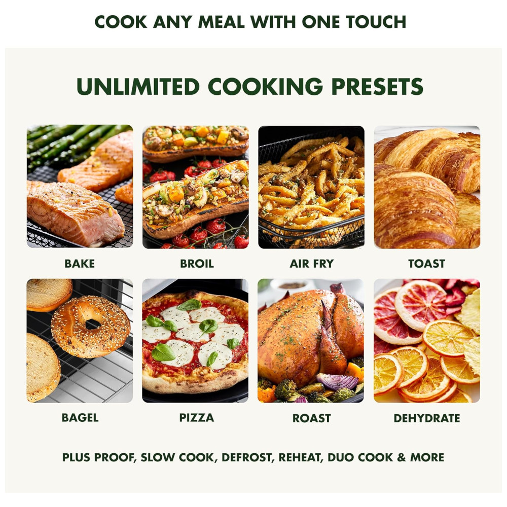 Funções do Forno (13 em 1): Versatilidade máxima para atender a todas as necessidades na cozinha com funções para assar, grelhar, tostar, air fry, preparo de bagel, pizza, desidratação, fermentação, cozimento lento, descongelamento, Duo Cook, entre outros.
