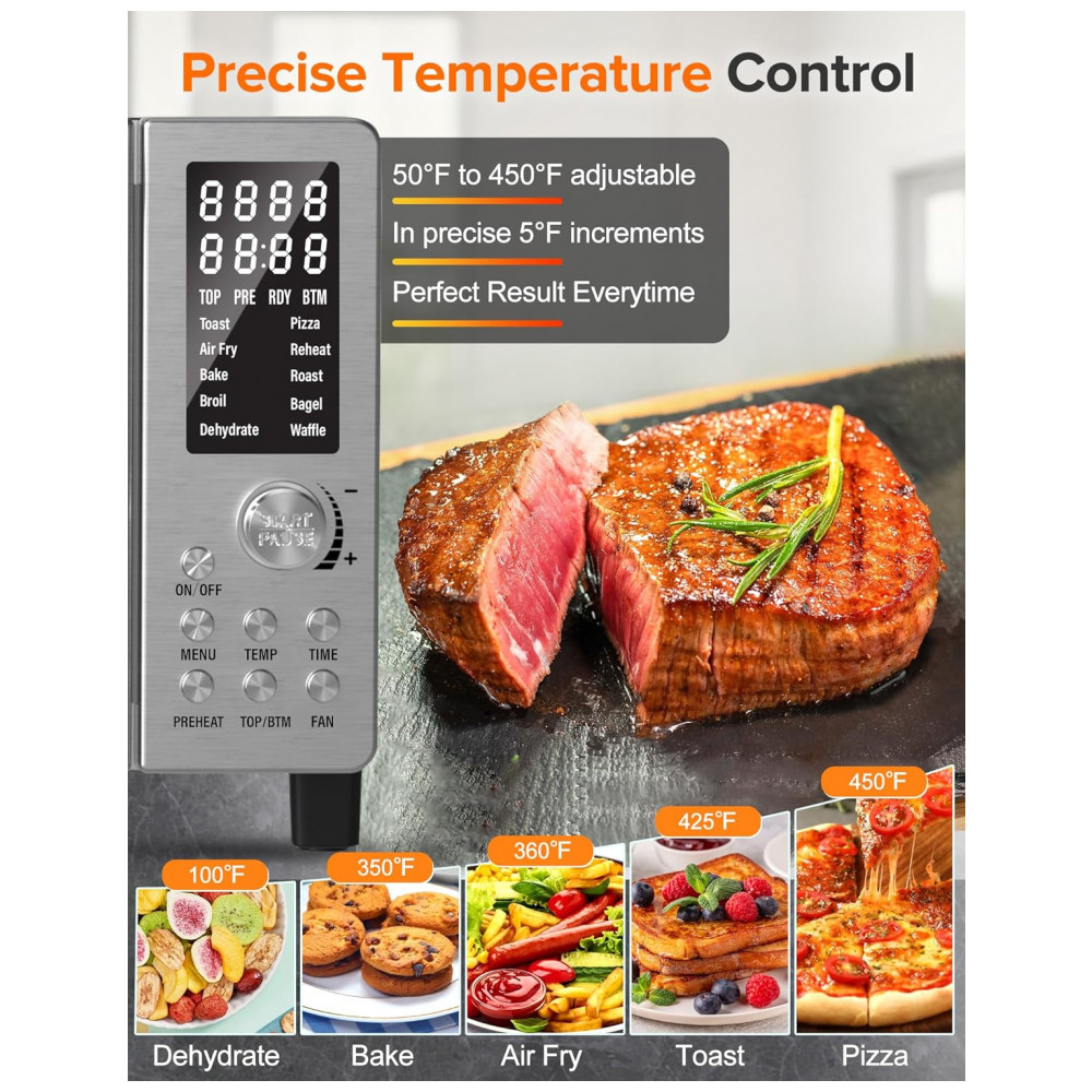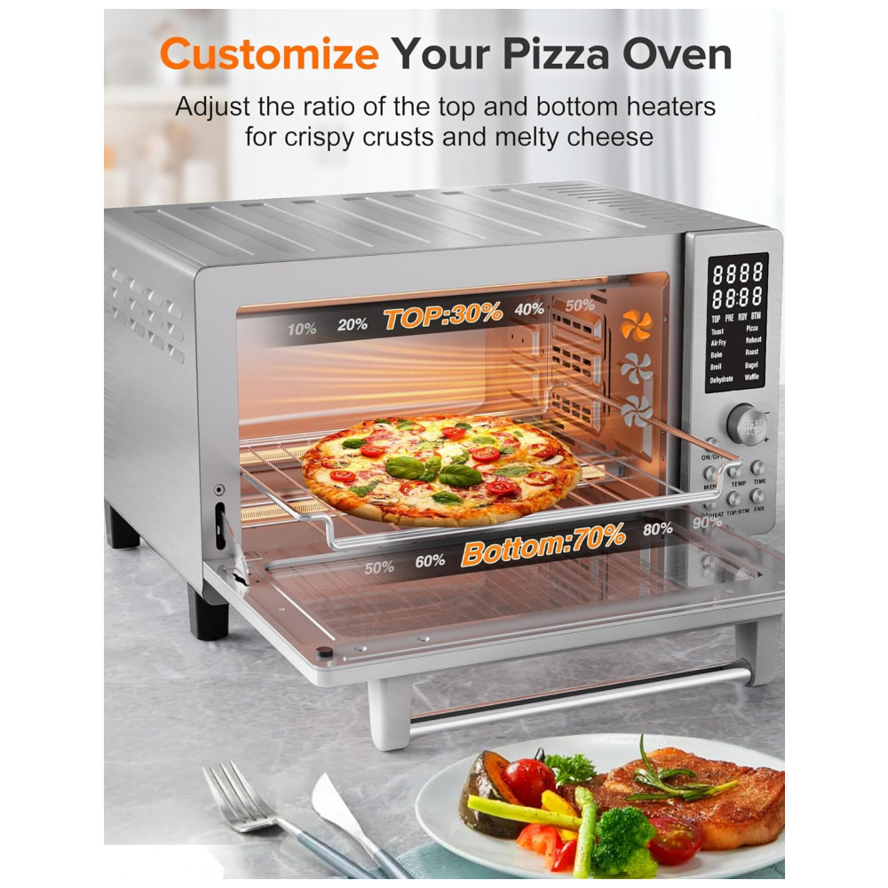 Personalização Completa do Forno: Ajuste a potência dos aquecedores superior e inferior de 0 a 100%, bem como a velocidade do ventilador de convecção, para diferentes tipos de zonas de aquecimento. Para assar uma pizza grossa e perfeita, defina o aquecimento inferior em 70% e o superior em 30% para um recheio perfeitamente derretido e uma crosta crocante.