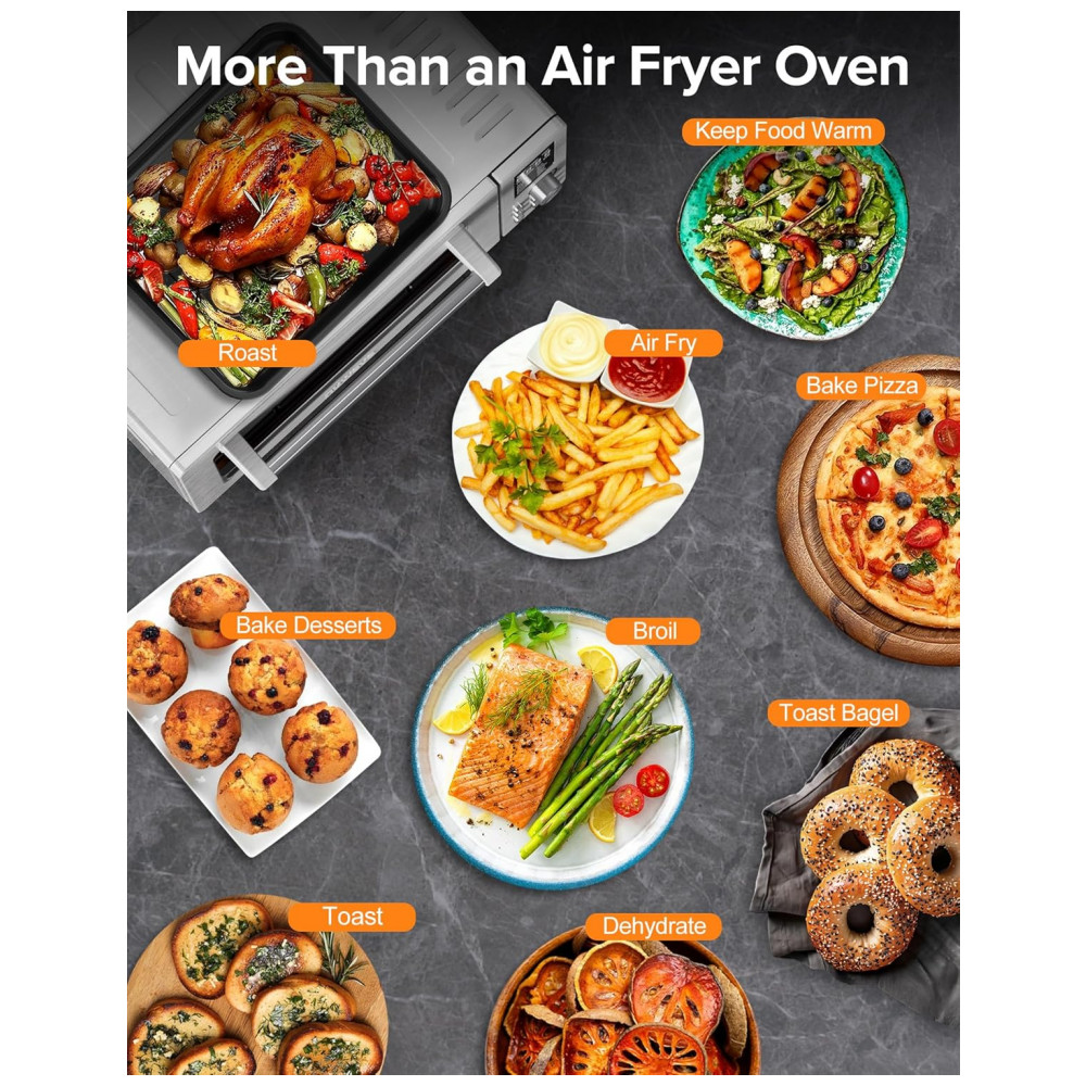 12 Programas Pré-Definidos: Com 1800 watts de potência, este forno elétrico multifuncional oferece 12 funções: Fritar, Grelhar, Assar, Reaquecer, Bagel, Pizza, Torrada, Gratinar, Waffle, Desidratar, Congelado e Manter Aquecido, tudo em um único aparelho poderoso.