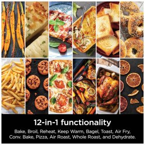 Explore uma gama de opções versáteis, incluindo Assar, Grelhar, Reaquecer, Manter Aquecido, Torrar, Bagel, Fritar ao Ar, Assar por Convecção, Pizza, Assar ao Ar, Assar Inteiro e Desidratar.