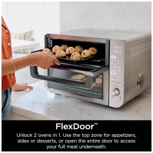 Com a tecnologia FlexDoor, escolha acessar apenas o forno superior para refeições rápidas ou abra a porta inteira para usar os dois fornos simultaneamente, com ajustes independentes.