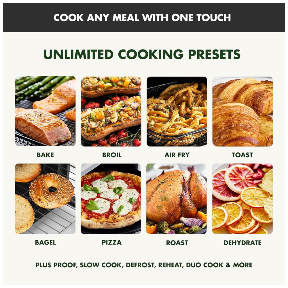 Design Multifuncional: Ideal para diversas funções de cozimento, como assar, grelhar, air fry, tostar, bagel, pizza, assar carnes, desidratar, fermentação, cozimento lento, descongelar e Duo Cook – um aparelho completo para sua cozinha!