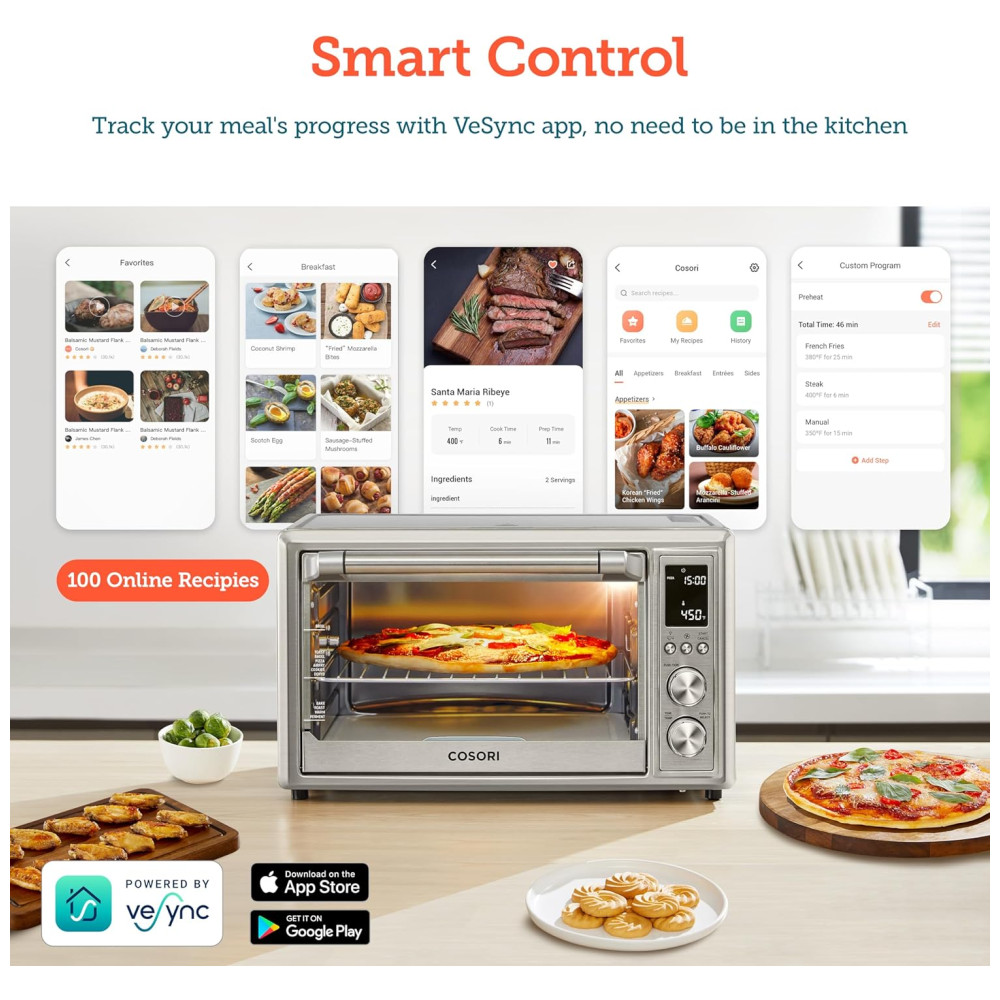Controle Inteligente: Com o aplicativo VeSync, você pode controlar o forno diretamente pelo smartphone, possibilitando cozinhar com um simples toque. Compatível com Amazon Alexa e Google Assistant, oferece também controle por voz para total comodidade e praticidade.