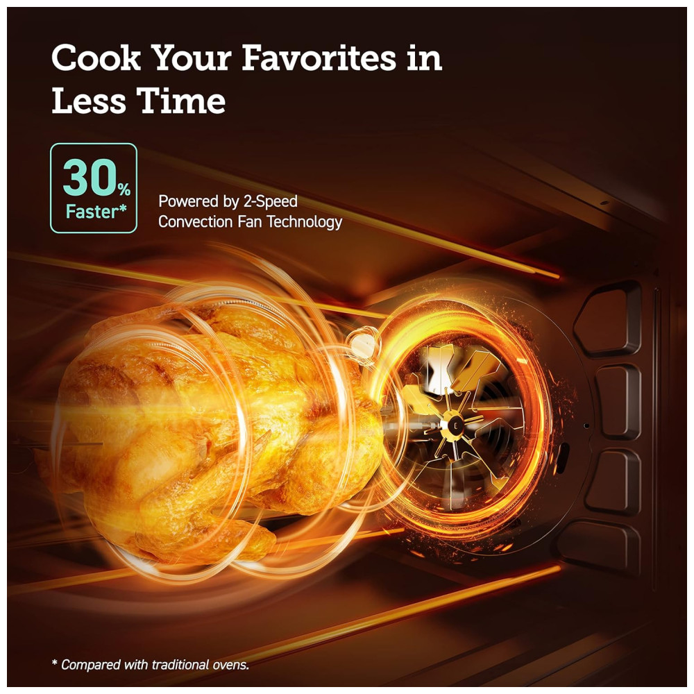 Refeições em Minutos: Com 4 elementos de aquecimento, ventilador de 2 velocidades e temperatura de até 232°C, o forno cozinha até 30% mais rápido do que fornos convencionais, tornando-se ideal para uma rotina prática e rápida.