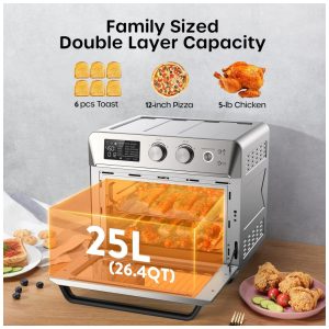 Perfeito para a Família: Com capacidade de 25 litros, atende bem as necessidades familiares. Suporta até 6 fatias de pão, uma pizza de 30 cm ou um frango inteiro de até 2,3 kg em uma única camada.