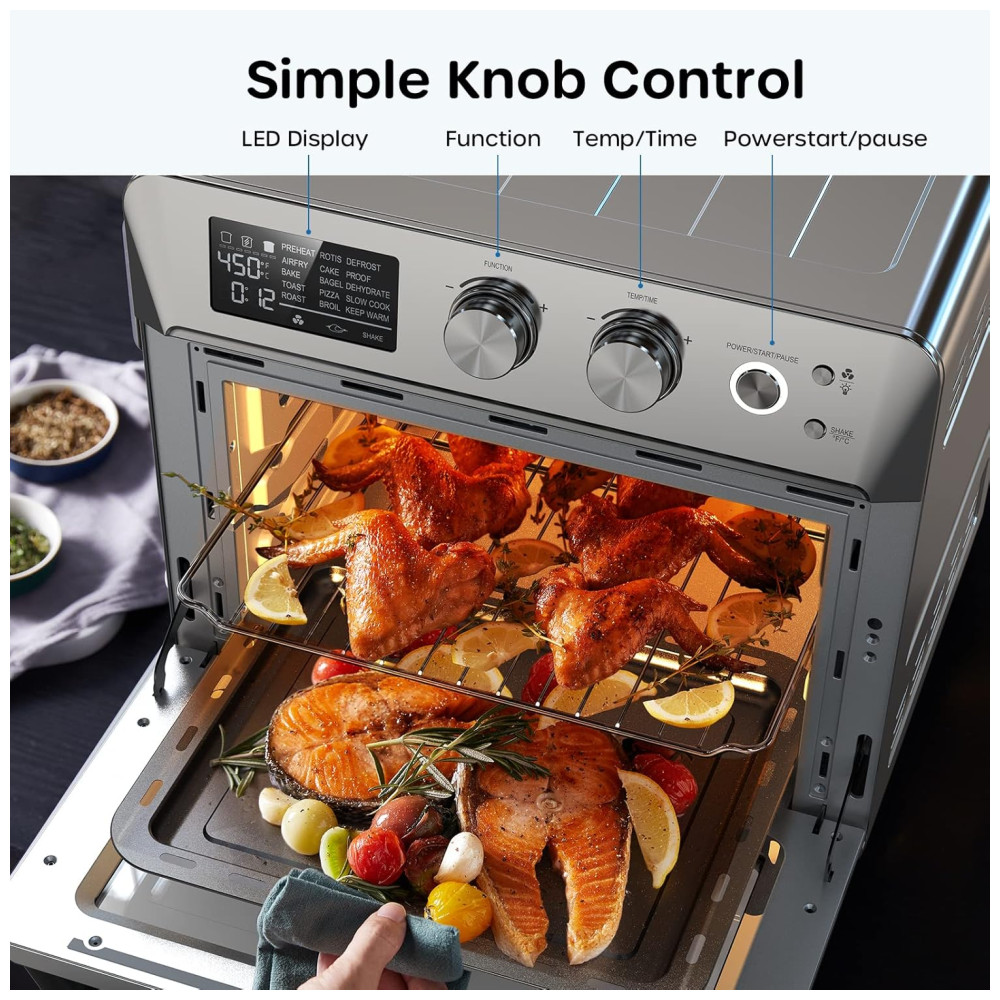Acessórios Inclusos: Aproveite ao máximo com 6 acessórios: elevador e garfo de rotisserie, cesto de air fryer, grelha, bandeja de assar/gotejamento e bandeja de migalhas removível.