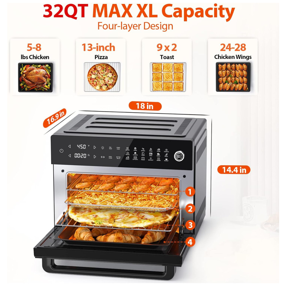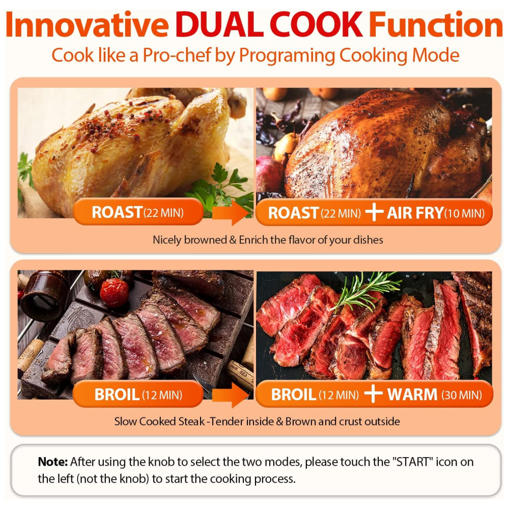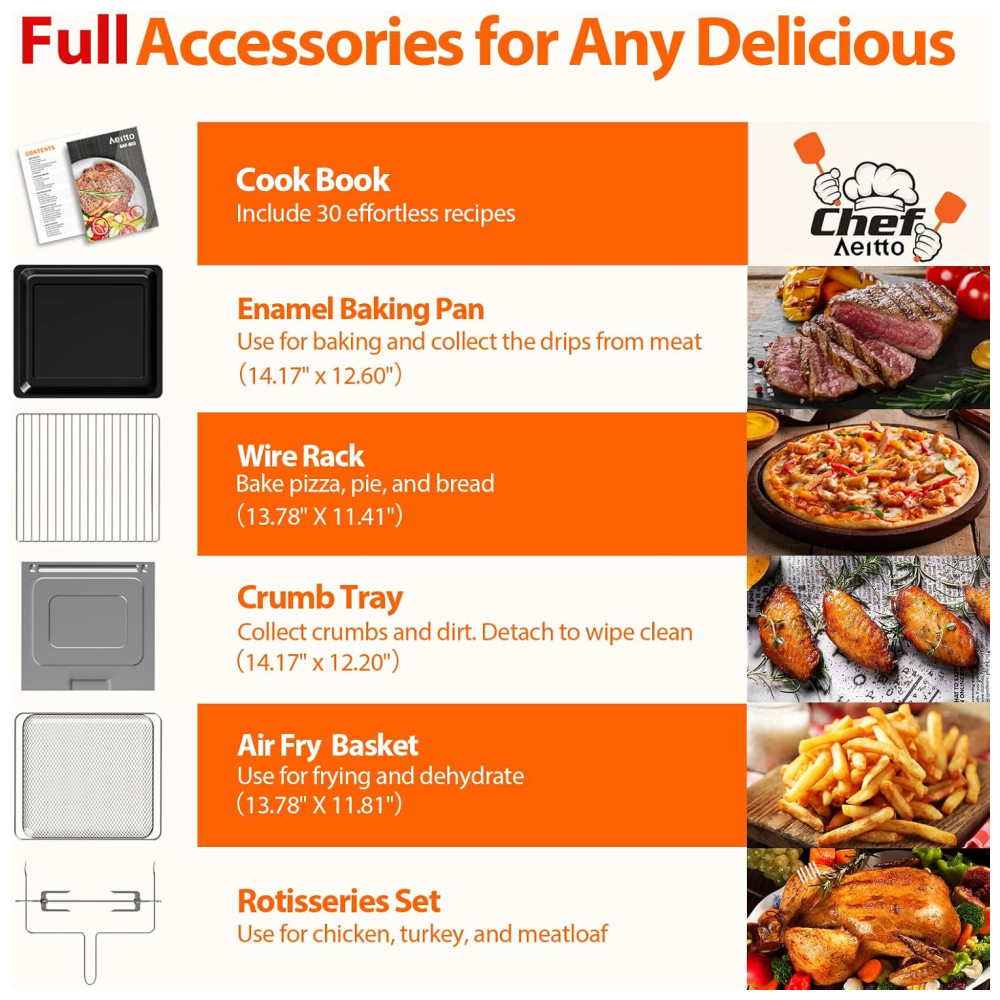 Acessórios Melhorados e Livro de Receitas: Inclui uma bandeja de esmalte antiaderente fácil de limpar, cesta de fritura, grade de forno, garfo para rotisseria, elevador de rotisseria e bandeja de migalhas. Todos os acessórios são destacáveis e laváveis em lava-louças, garantindo uma limpeza prática.