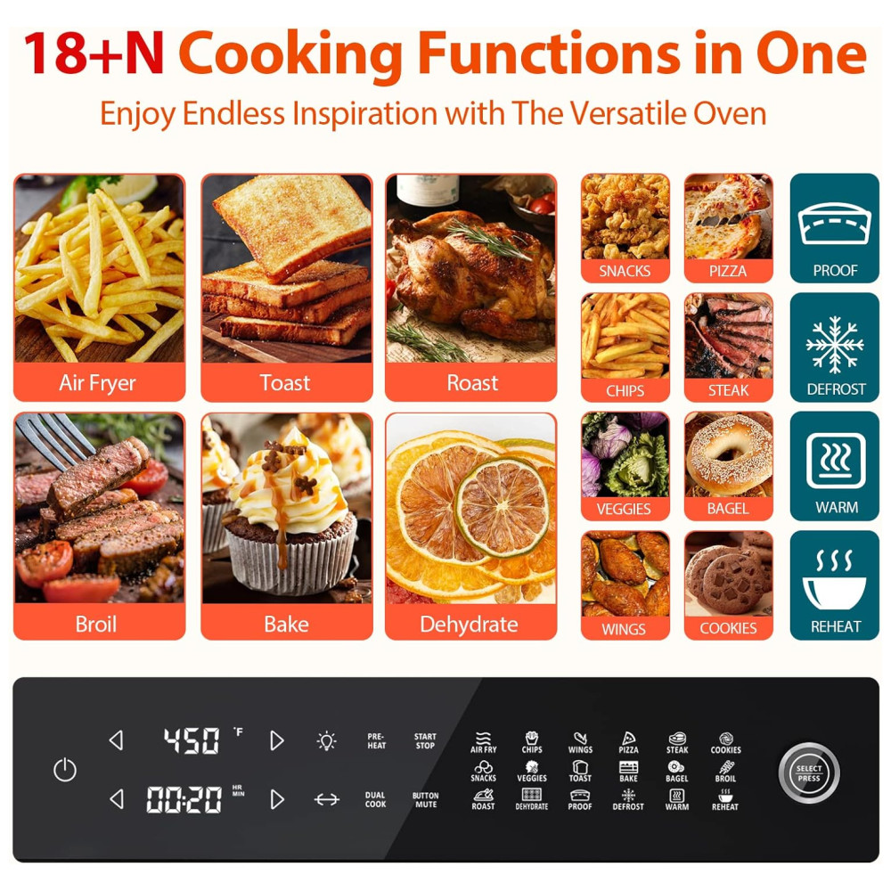 18+ Predefinições e 6 Funções Combinadas: Substitua vários eletrodomésticos com uma única máquina multifuncional que realiza funções como fritura sem óleo, assar, grelhar, tostar, desidratar, rotisseria, descongelar, aquecer e fermentar, economizando espaço na bancada.