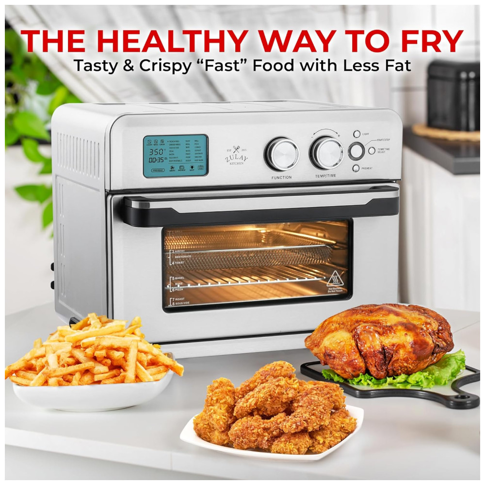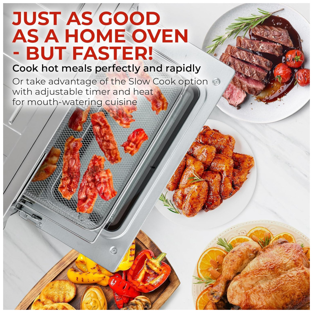 21 FUNÇÕES PRÉ SET: Reduza o óleo da sua dieta e comece a fazer refeições saudáveis com o forno com fritadeira Este versátil forno de bancada pode fazer muito mais do que apenas fritar com suas funções de cozimento com um toque torradas, grelhar, assar, assar, provar, reaquecer, grelhar, desidratar, sous vide, ou faça batatas fritas, asas de frango, bife, bacon, pizza, biscoitos e muito mais. Um forno inteligente que faz tudo