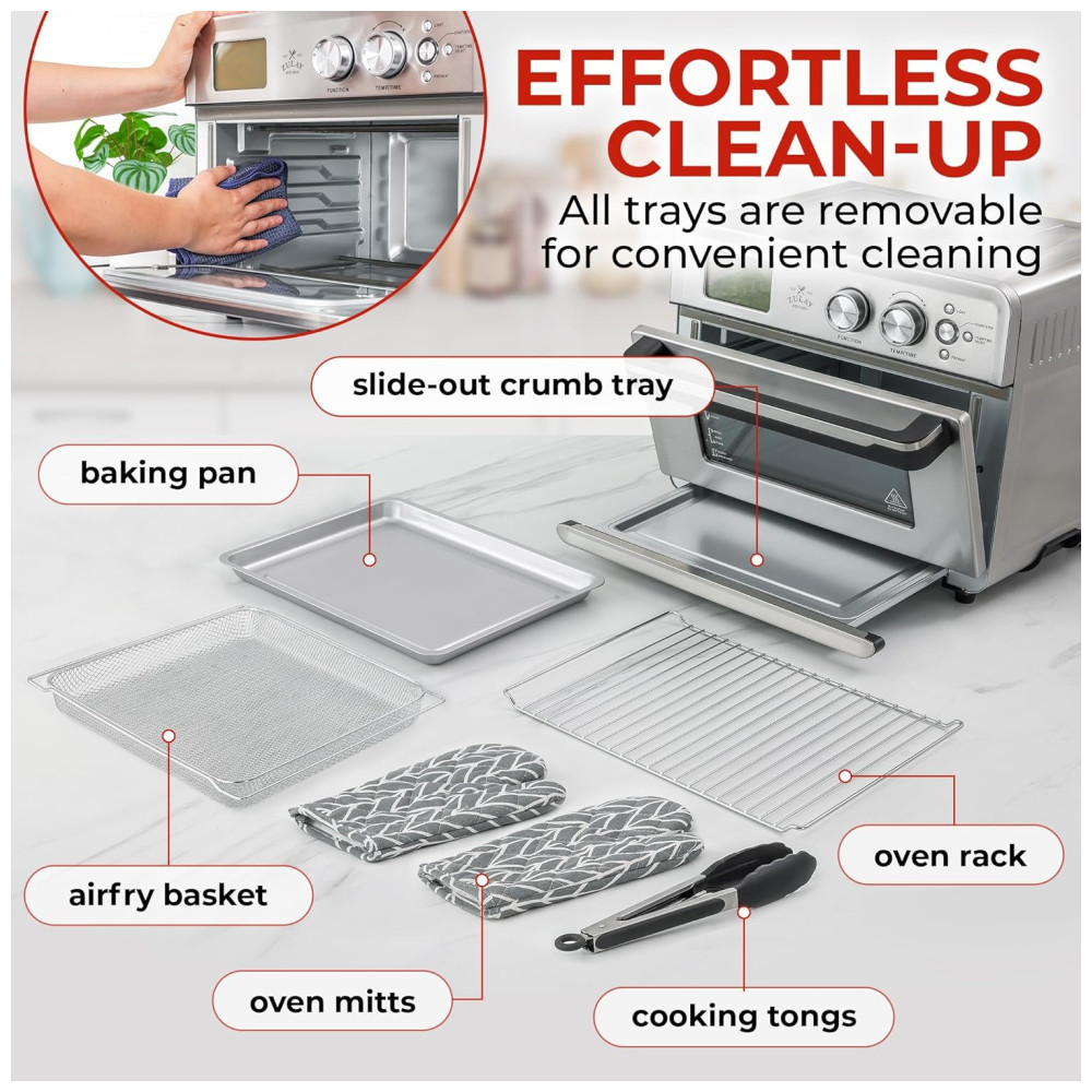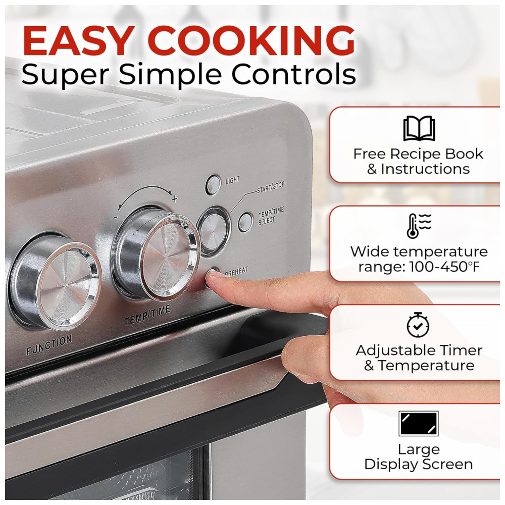 COZINHA SEM CASSOS: Este forno de bancada vem com um grande display digital, facilitando a seleção de várias funções de cozimento e o ajuste da hora , temperatura usando os botões de controle. Ele também vem com uma assadeira de , cesto de frituras de , rack de forno de , luvas de cozinha, um livro de receitas, um manual de instruções e pinças de cozinha.