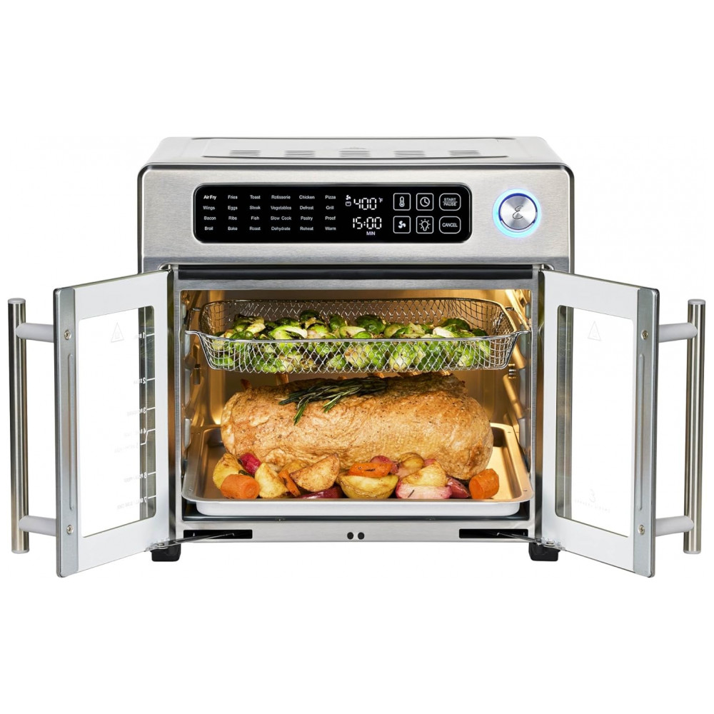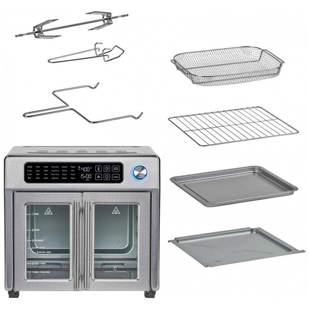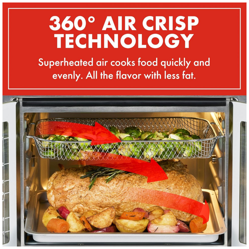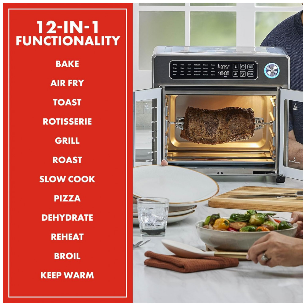 Design em Aço Inoxidável e Portas Elegantes: O exterior em aço inoxidável proporciona um visual sofisticado que combina com qualquer cozinha. As portas francesas elegantes abrem com um único puxão, e a luz interna permite monitorar o cozimento dos alimentos com facilidade.