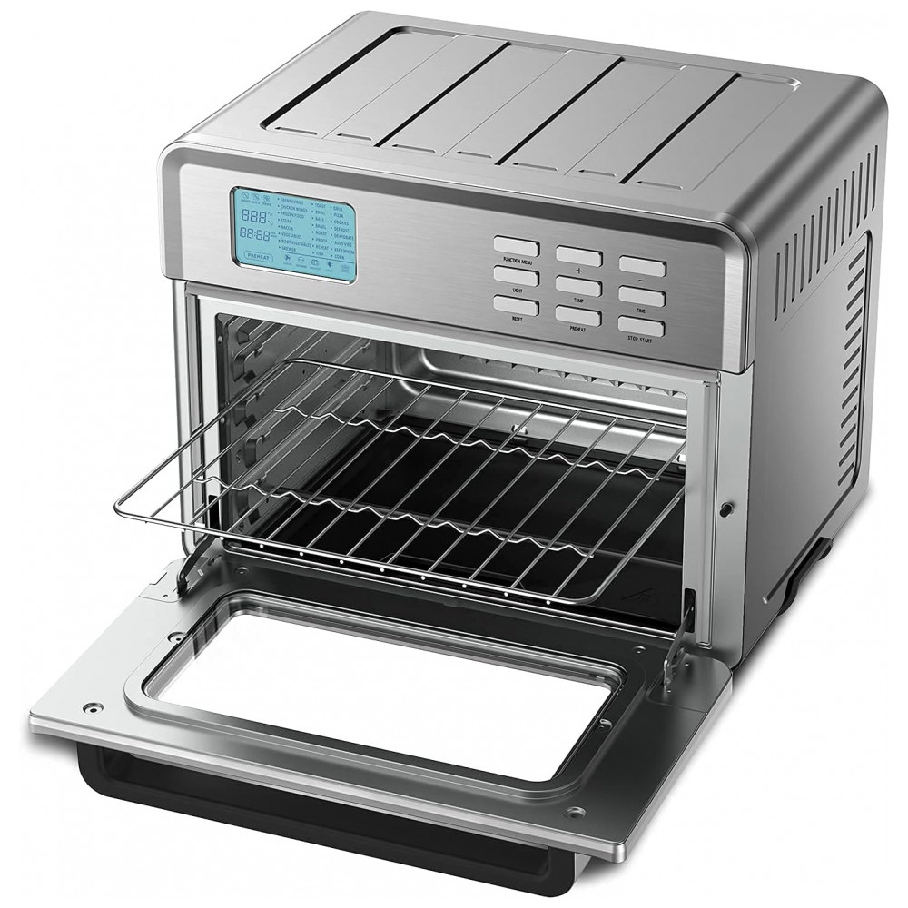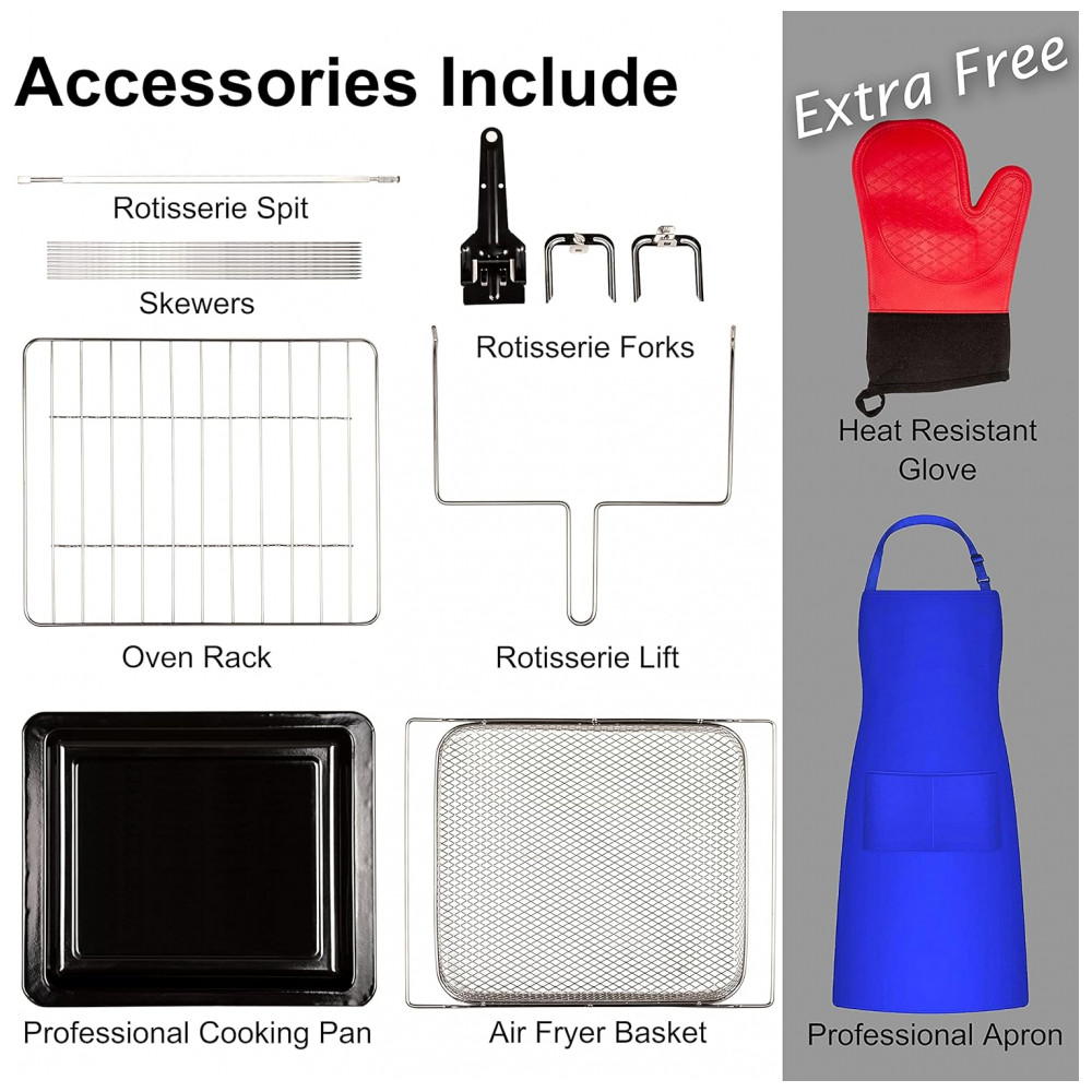 Possui muitas peças antiaderentes, incluindo rack de forno, bandeja de desidratação, assadeira e cesta de fritadeira. Essas peças podem ser limpas simplesmente passando um pano úmido.