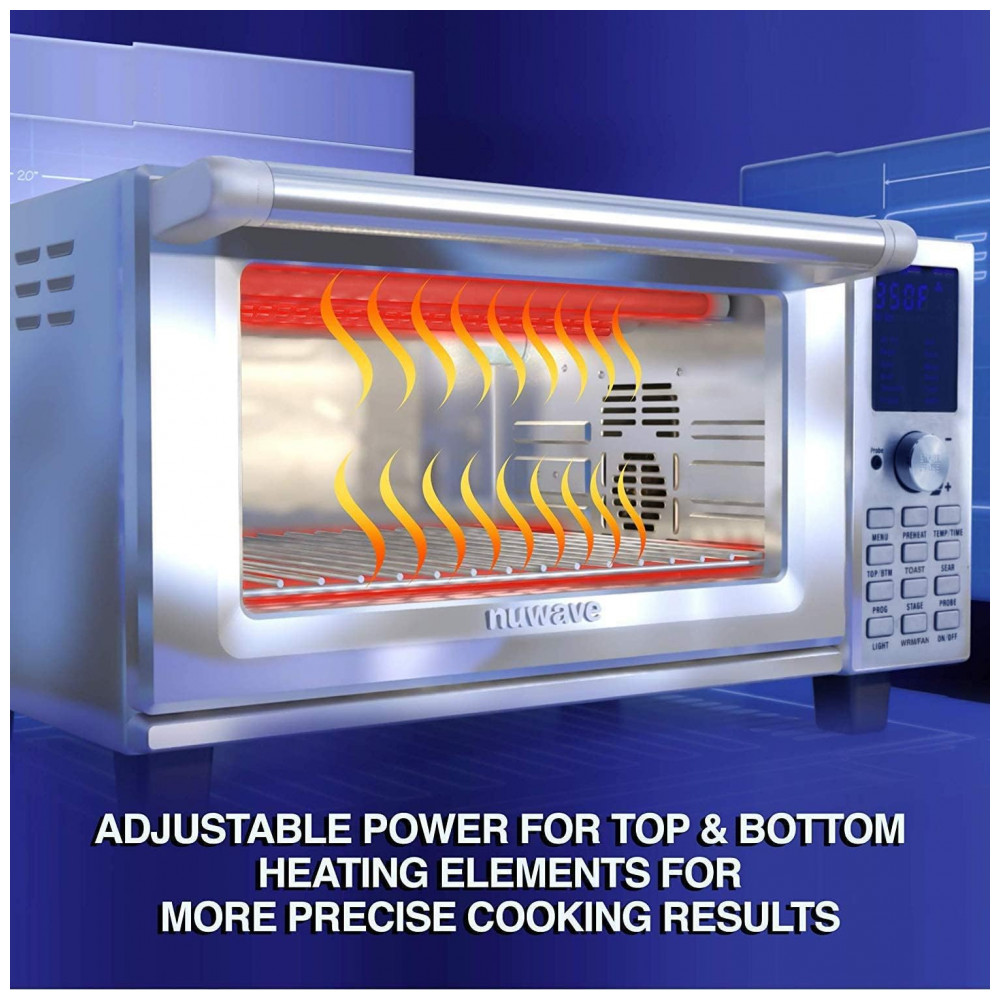 Descubra a versatilidade e precisão do NuWave Bravo XL, um forno elétrico com função de air fryer que permite ajustar facilmente temperatura e tempo durante o processo de cozimento, sem a necessidade de reiniciar o aparelho. Com controles digitais intuitivos, você pode personalizar a potência dos aquecedores superior e inferior para obter resultados perfeitos. Para uma pizza crocante, por exemplo, ajuste o aquecedor inferior em potência máxima e o superior em 30%, garantindo uma crosta crocante e queijo perfeitamente derretido.