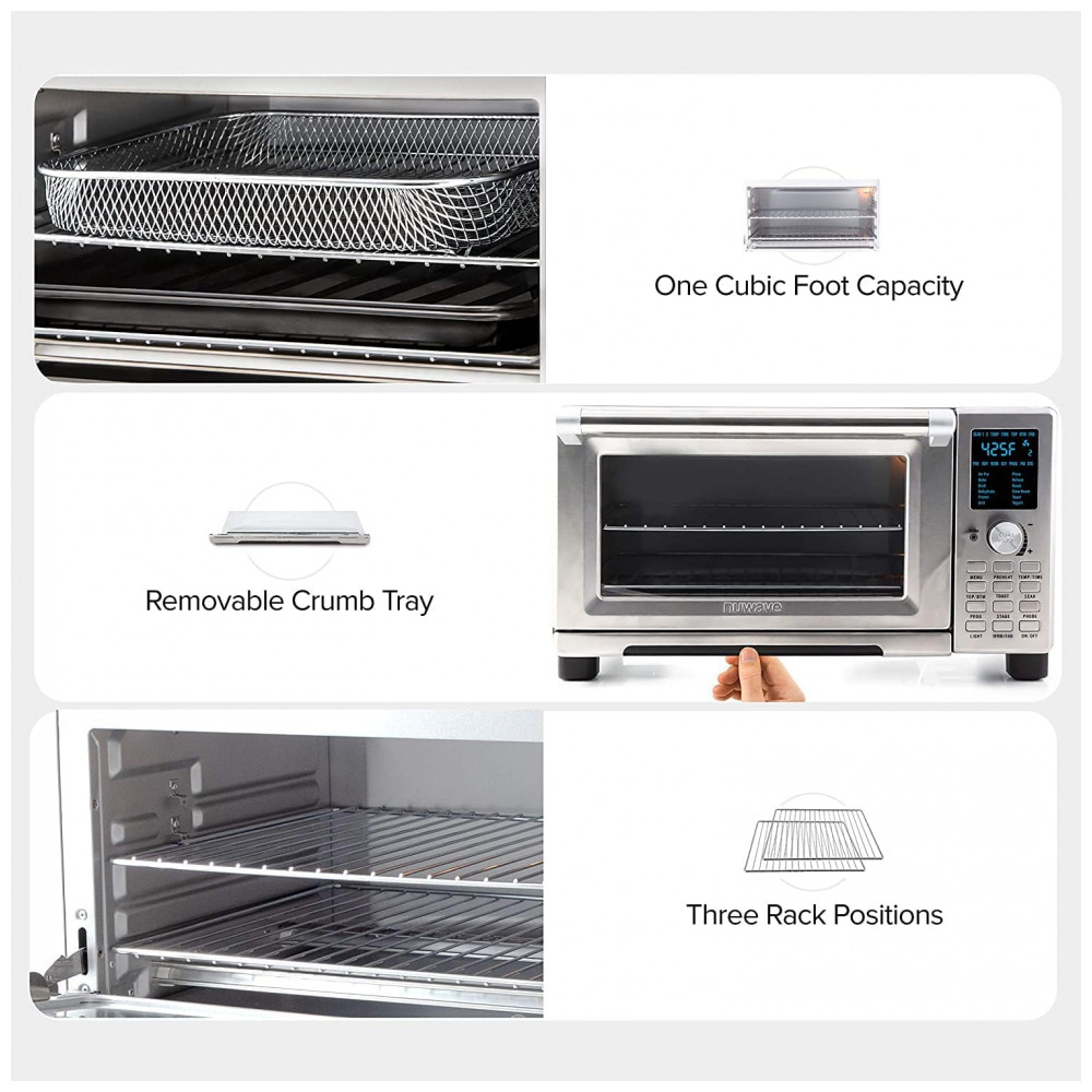 Construção de Alta Qualidade: Com uma porta de vidro temperado resistente ao calor e à quebra, grades de cozimento robustas, uma assadeira antiaderente com grelha para gratinar, bandeja de migalhas e cesto para fritura com ar, o NuWave Bravo XL é feito com materiais de alta qualidade, proporcionando durabilidade e praticidade.