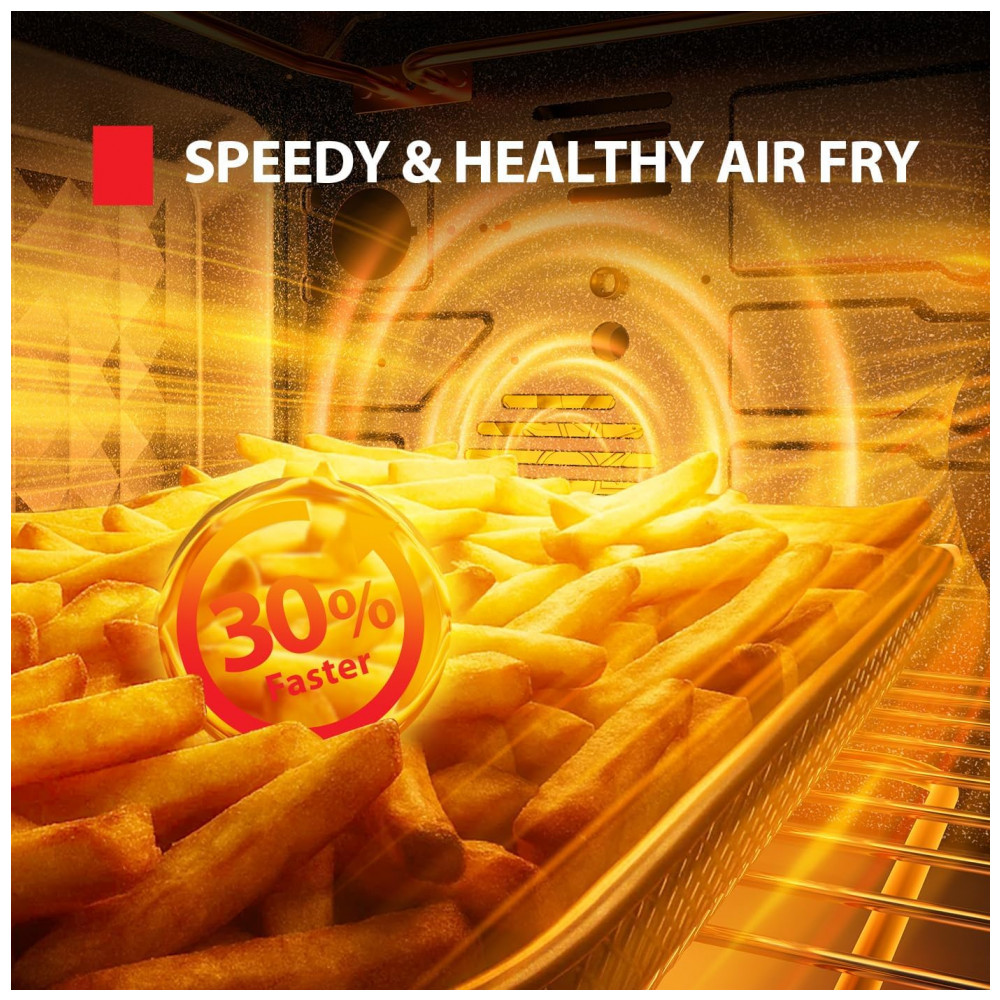 Recursos e tecnologias: Convecção com ventiladores Turbo Cyclone, tecnologia Dual-Temp para pizza, porta com vidro duplo de toque mais frio, interior esmaltado resistente a riscos, 12 modos de cocção, capacidade para frango de aproximadamente 4,5 kg ou duas pizzas de 33 cm