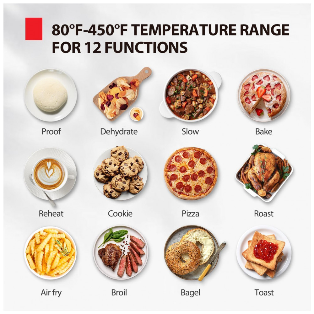 O equipamento oferece 12 modos de cocção, cobrindo desde fermentação suave de massas em torno de 27 °C até fritura com ar em temperaturas próximas de 232 °C. Entre as funções disponíveis estão pizza, bagel, air fry, torrada, assar, assar carnes (roast), gratinar (broil), cookie, reaquecer, cozimento lento, desidratar e função de fermentação (proof), permitindo adaptar o modo de preparo ao tipo de alimento.