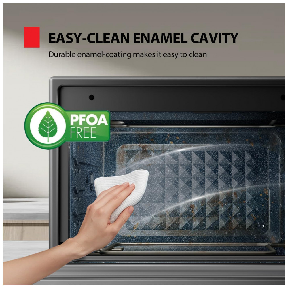 A porta com vidro temperado duplo foi projetada para manter a face externa sensivelmente mais fria em comparação a portas padrão, reduzindo a transferência de calor para o ambiente e o risco de contato acidental com superfícies muito aquecidas. O interior em esmalte resistente a riscos facilita a limpeza, permitindo remoção de respingos e gordura com pano macio e água morna após o uso, sem necessidade de esfregar intensamente.