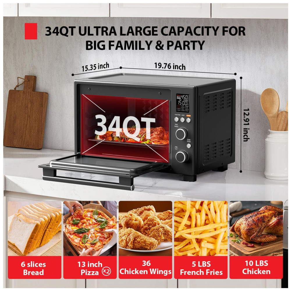 Funções de cocção: Pizza, bagel, air fry, torrada, assar, assar carnes (roast), gratinar (broil), cookie, reaquecer, cozimento lento (slow), desidratar, fermentação (proof)