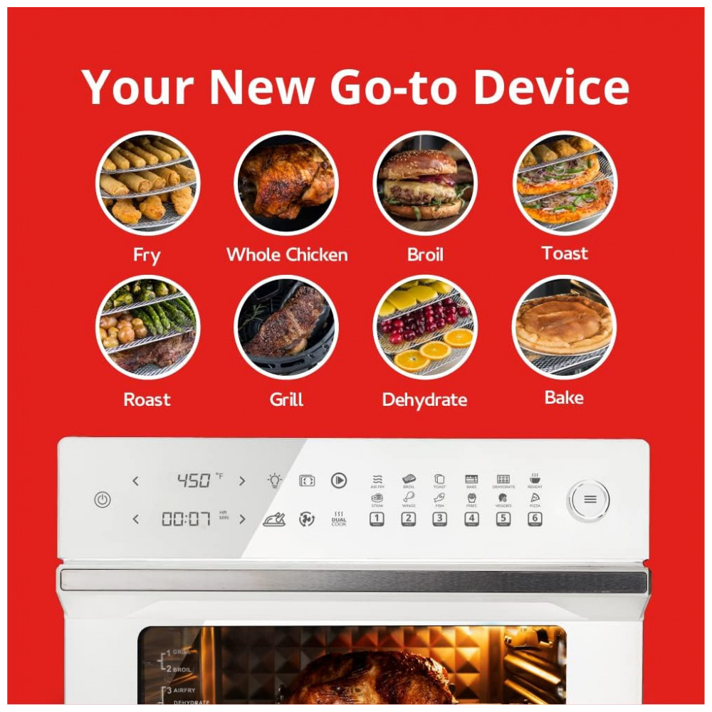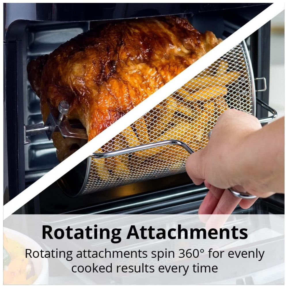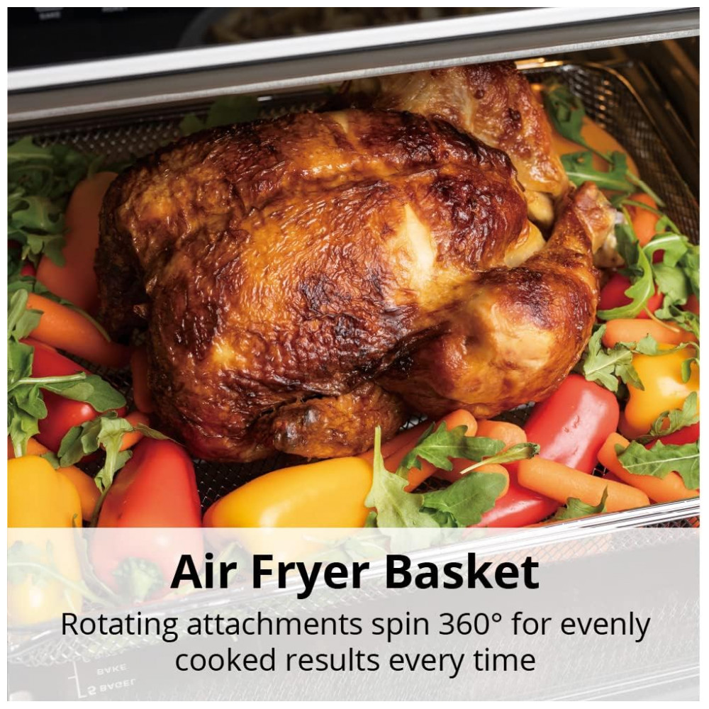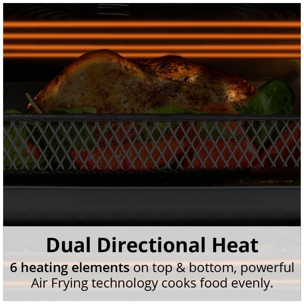 Aquecimento Rápido até 232°C: Utiliza 6 elementos de aquecimento na parte superior e inferior, juntamente com tecnologia poderosa de air frying, para cozinhar e deixar os alimentos crocantes de maneira uniforme e rápida. Asse, frite, reaqueça, toste e grelhe carnes, cafés da manhã, sobremesas e vegetais mais rápido que fornos tradicionais, de convecção ou micro-ondas. O calor de 360 graus também imita o cozimento estilo rotisserie para frango suculento e macio a qualquer momento.