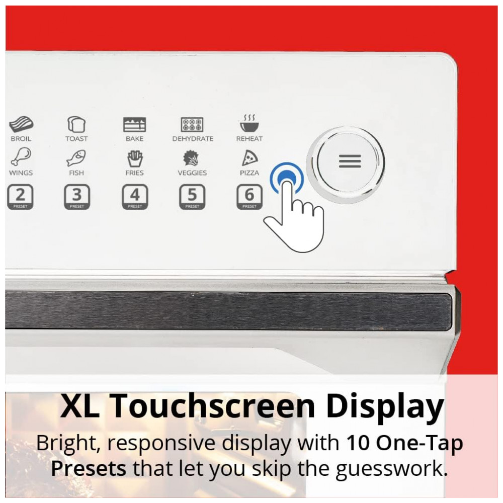 10 Predefinições de Cozimento Convenientes: Escolha entre 10 predefinições ou personalize 6 opções no touchscreen iluminado para pratos populares como frango, frutos do mar, batatas fritas, sobremesas e mais. Elimine as suposições e aproveite refeições preparadas com perfeição assim que ouvir o sinal sonoro.
