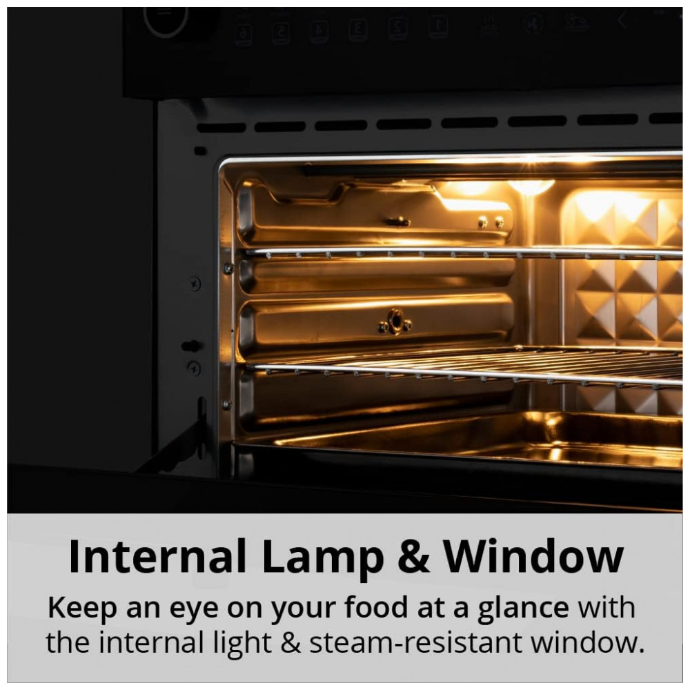 Design Espaçoso de 34 Litros: Com 3 níveis de cozimento, permite preparar diferentes refeições simultaneamente ou porções maiores dos seus pratos favoritos para toda a família ou convidados. Asse múltiplas pizzas de 33 cm, frango inteiro suculento, legumes salteados ou deliciosas sobremesas para todos desfrutarem.