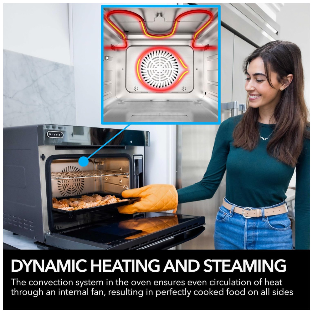 Sistema de Aquecimento e Convecção com Vapor Dinâmico: Com um sistema interno de circulação de calor e vapor, o ventilador distribui o ar quente e o vapor uniformemente, garantindo um cozimento perfeito e uniforme em todos os lados do alimento.
