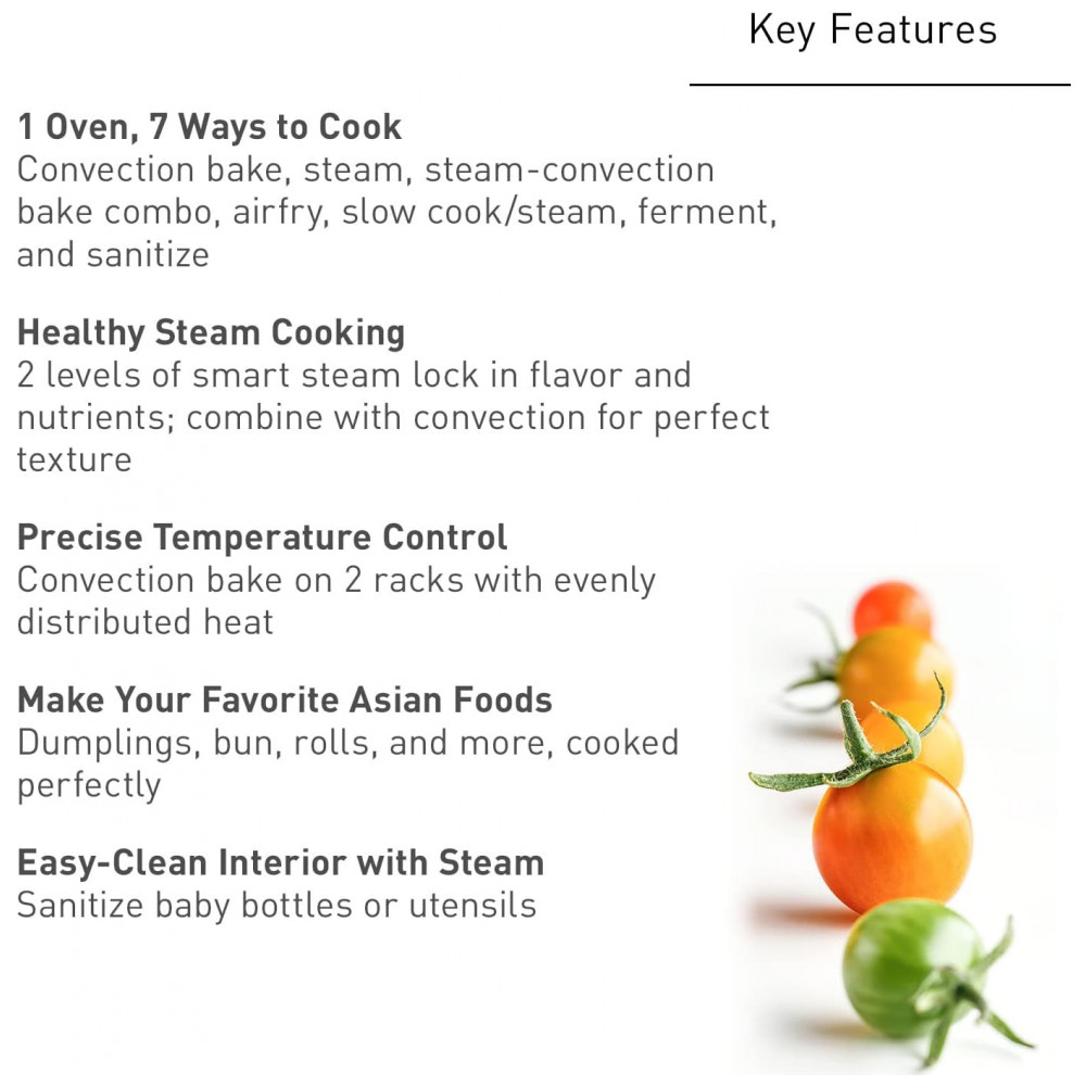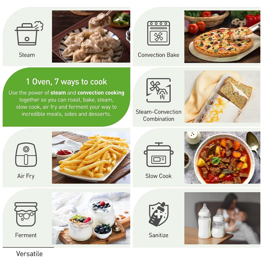 7 Funções em 1: Oferece modos de Convecção, Vapor, Assado com Vapor e Convecção, Airfry, Cozimento Lento, Fermentação e Sanitização, ideal para preparar desde pratos leves e crocantes até receitas fermentadas como iogurte, além de esterilizar utensílios e mamadeiras.