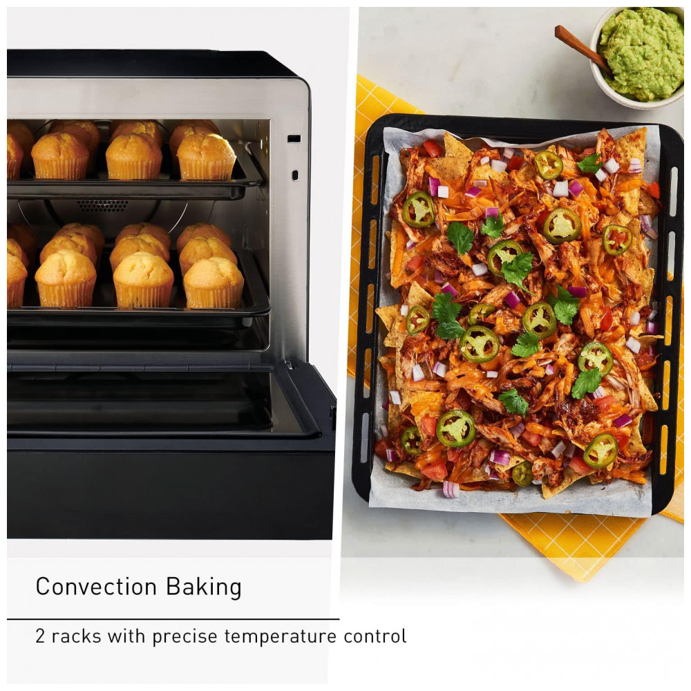 Convecção e Vapor Combinados para Sabor e Textura: Controle preciso de temperatura no modo convecção e duas prateleiras que distribuem o calor de forma uniforme, garantindo cozimento homogêneo e eficiente. O modo Convecção com Vapor adiciona umidade ao cozimento, resultando em bolos mais macios e carnes mais suculentas.