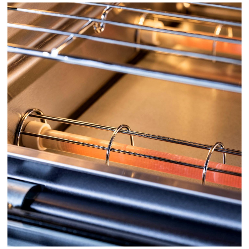 Grande Capacidade: Com uma cavidade espaçosa, este forno acomoda pizzas de até 30 cm, formas de bolo de 23 x 33 cm e travessas de 2 litros, sendo ideal para porções generosas e preparos em estilo festa.