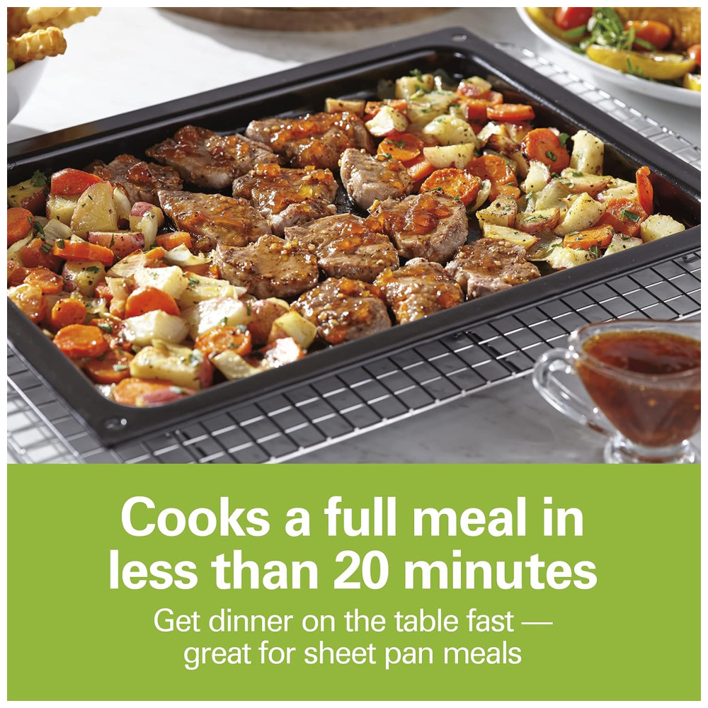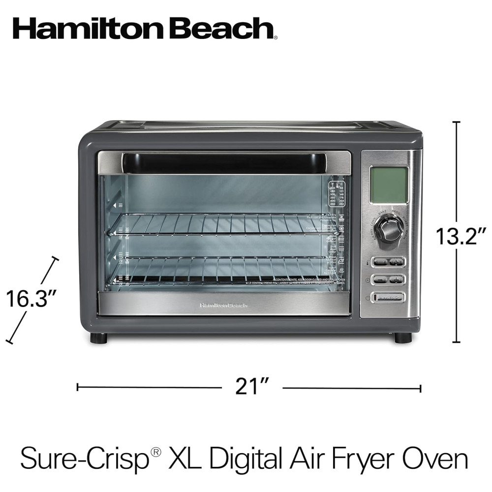 Este forno é perfeito para fritar asas de frango, batatas fritas, bife, peixe, legumes e muito mais. O forno possui controles digitais fáceis de usar e 6 modos de cozimento fritar, assar, assar por convecção, grelhar, assar e manter aquecido, além de uma função Stay On. Com controle de temperatura preciso, o forno cozinha uniformemente sem pontos quentes em temperaturas que variam de 150 a 450 F 65 a 232C. O forno de capacidade extra grande tem espaço para cozinhar todos os seus alimentos favoritos.