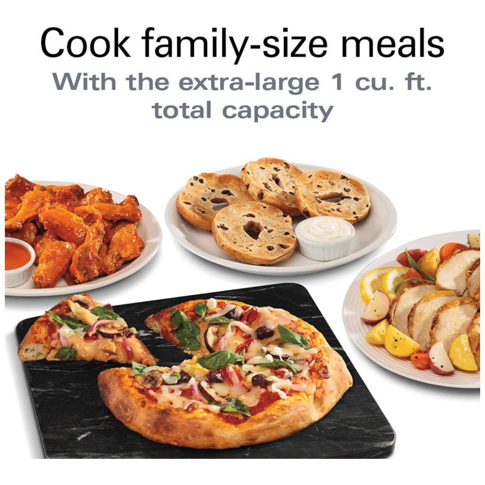 COZINHE AS REFEIÇÕES FAMILIARES O grande forno de bancada permite que você cozinhe uma pizza de , 2.7L de frango, 6 fatias de torrada ou uma panela de 22 x . Ele também tem 3 posições de prateleira para acomodar uma variedade de necessidades de cozimento.