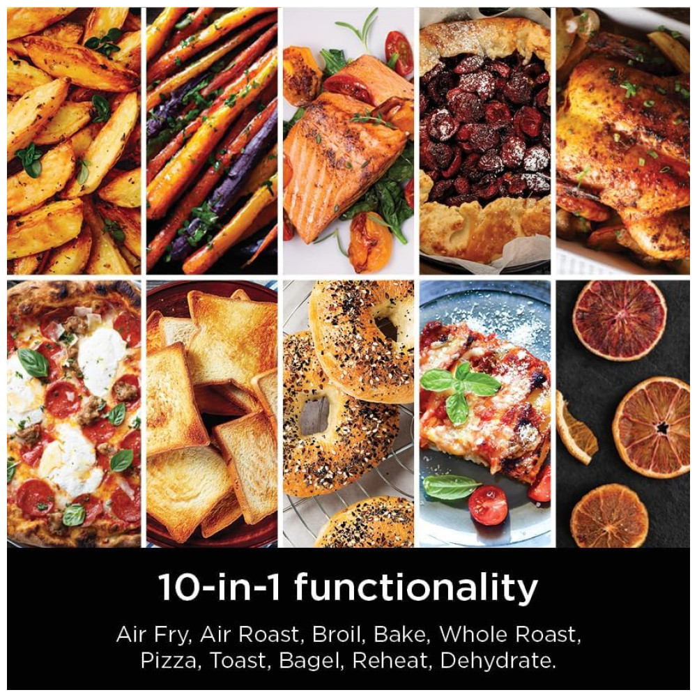 Desfrute de 10 programas versáteis de cozimento, incluindo Air Fry, Air Roast, Grelhar, Assar, Assado Completo, Pizza, Torrar, Bagel, Reaquecer e Desidratar. Um equipamento completo para criar refeições variadas.