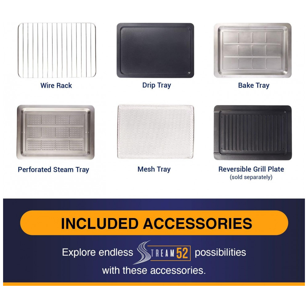 Programas de Menu Predefinidos: O Stream 52 oferece múltiplas opções para grelhar, assar, tostar, desidratar, fermentar, reaquecer e muito mais, proporcionando versatilidade e facilidade para explorar uma ampla gama de receitas.