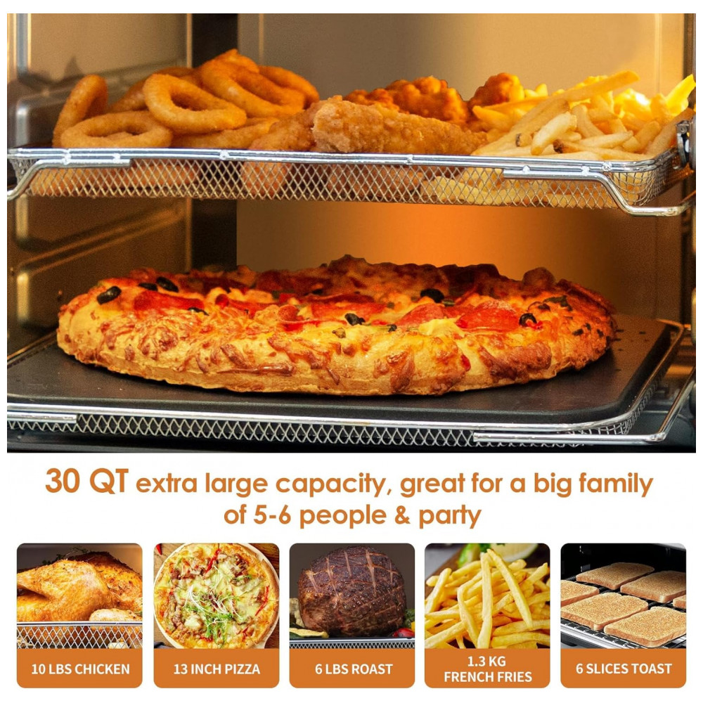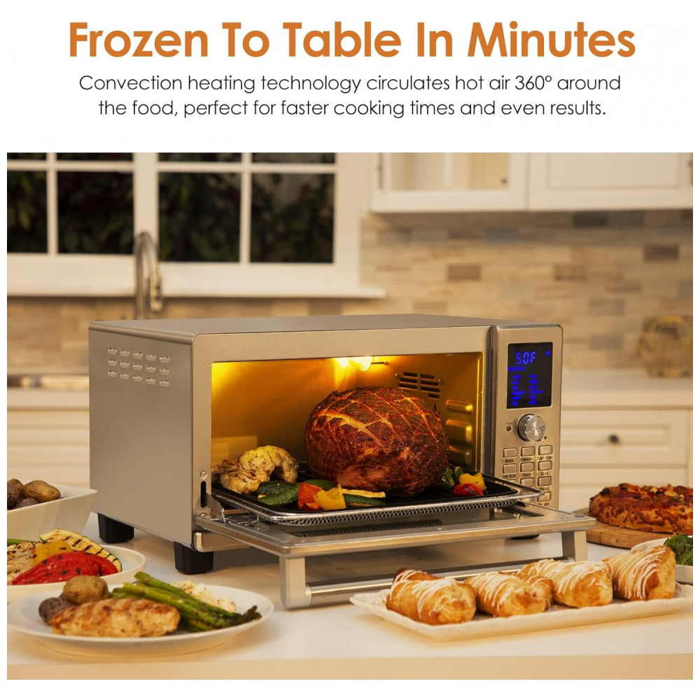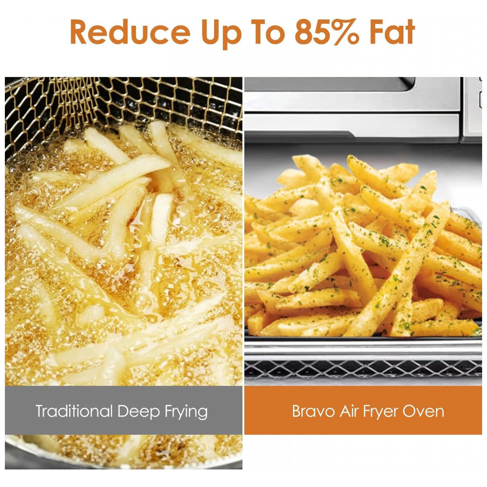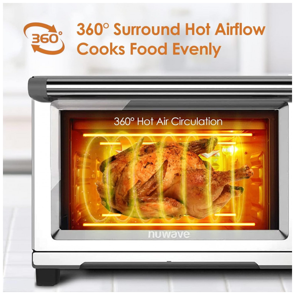 O Nuwave Bravo XL Grill é um forno elétrico de bancada multifunção com capacidade de 30 quarts (cerca de 28 litros), combinando funções de air fryer, forno de convecção, grill e torradeira em um único equipamento. Ele trabalha com faixa de temperatura ajustável de 50 °C a 260 °C, em incrementos de 5 °C, permitindo desde desidratar alimentos em baixa temperatura até grelhar e assar em alta temperatura.