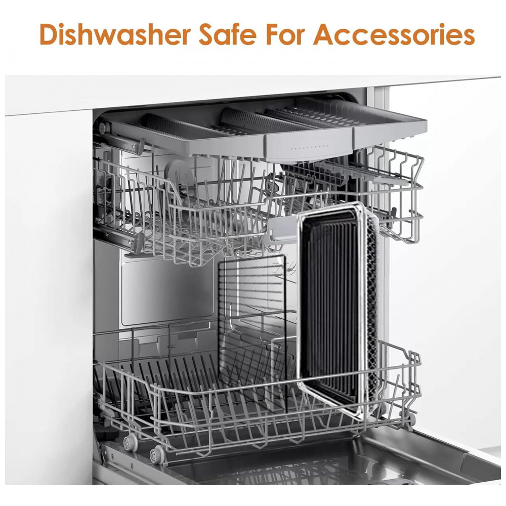 A grelha/chapas PFAS free utiliza revestimento cerâmico antiaderente, projetado para melhor retenção de calor e formação de marcas de grelha nos alimentos. O forno dispõe ainda de modo de cocção residual (carryover cooking) e de termômetro inteligente que monitora a temperatura interna do alimento, ajudando a atingir o ponto desejado sem necessidade de supervisão constante.