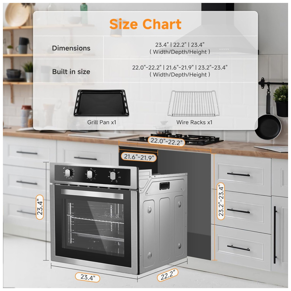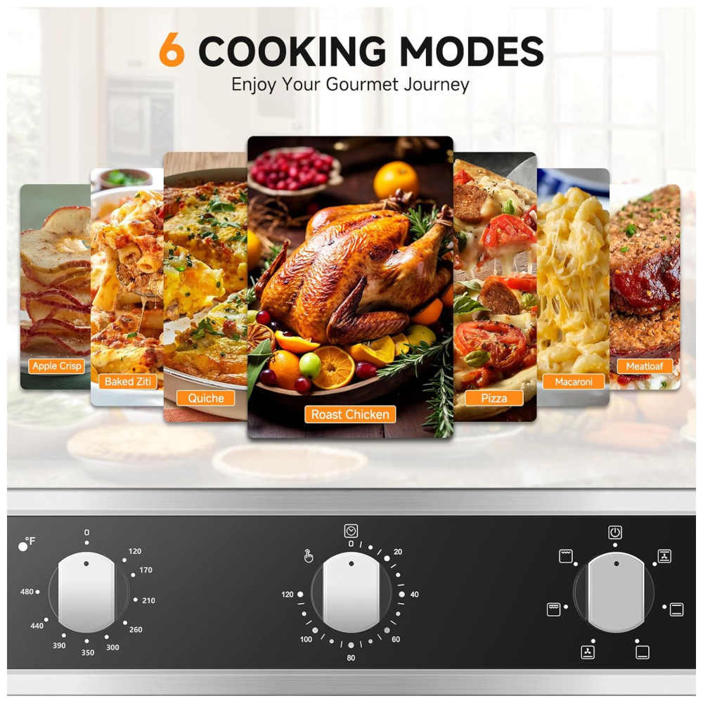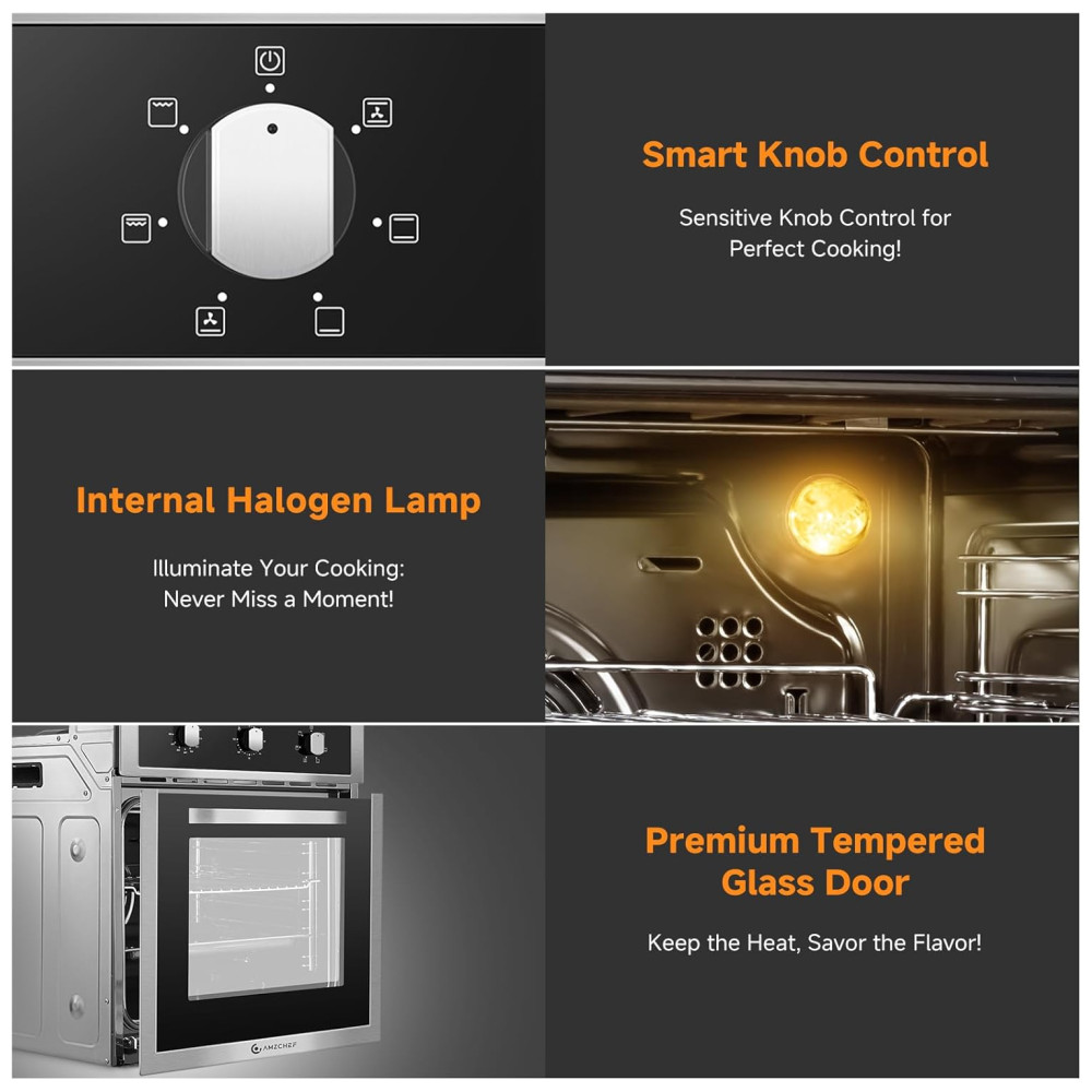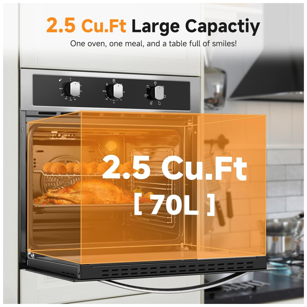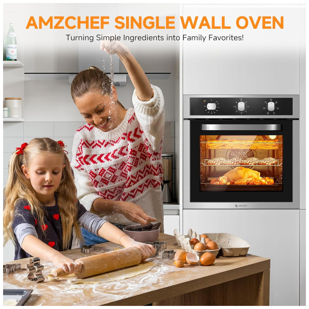 O Forno Elétrico de Parede da AMZCHEF oferece 6 modos de cozimento, tornando-o versátil para assar cookies delicados e suculentos frangos dourados. Com elementos de aquecimento superior e inferior bem projetados e um potente sistema de convecção, este forno garante distribuição de calor uniforme, proporcionando uma temperatura perfeita de forma consistente. Com capacidade generosa de 70 litros, o forno elétrico proporciona amplo espaço para preparar várias receitas ao mesmo tempo. Seus controles intuitivos permitem ajustes fáceis, sendo acessível até para quem não está familiarizado com dispositivos eletrônicos. Com um design elegante em aço inoxidável e porta de vidro temperado, esse forno se integra facilmente à maioria das cozinhas. Com 2200W de potência, ele aquece rapidamente, oferecendo uma ampla faixa de temperatura de 120 a 480 graus. Possui também função de timer de 2 horas, permitindo que você programe seus pratos e se afaste sem preocupações. Com cada uso, espere resultados excepcionais que elevam sua culinária a novos patamares, tornando a hora das refeições uma experiência encantadora.