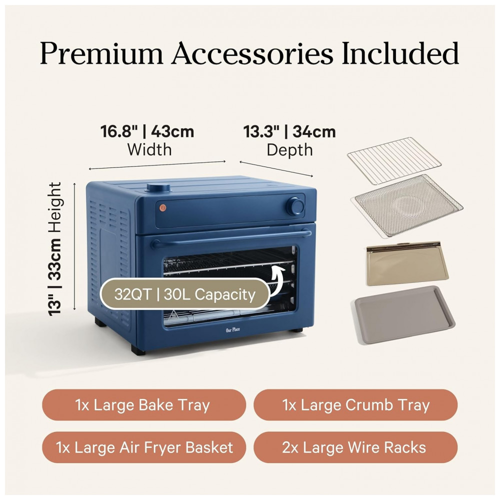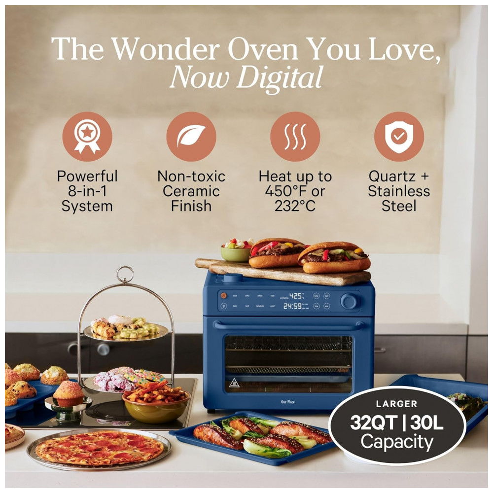 Forno Elétrico Digital 8 em 1 Our Place Wonder Oven Pro 30L Azul Blue Salt Quartzo e Inox Air Fry 1700W 3 Prateleiras Sem PFAS 110V