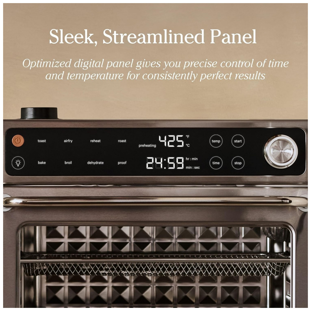 Forno elétrico digital Our Place Wonder Oven Pro 30L une alta capacidade familiar e versatilidade em oito funções: air fry, assar, tostar, gratinar, desidratar, fermentar, reaquecer e vaporizar. O painel touchscreen intuitivo permite controle preciso de tempo e temperatura. O sistema de aquecimento em quartzo e aço inox proporciona resultados uniformes e até 40% mais rápidos, alcançando até 232°C. Interior livre de químicos PFAS — não tóxico, seguro para o preparo diário. Possui três níveis de prateleiras e acessórios de longa duração: bandeja de assados, cesta de air fryer, prateleiras de arame e bandeja de migalhas. Indicado para refeições de grandes volumes, uso doméstico intenso e fácil de limpar.