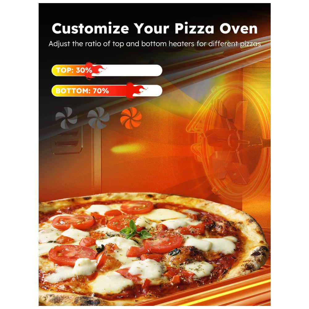 PERSONALIZE SEU FORNO DE PIZZA: Ajuste a proporção dos aquecedores superior e inferior de 0 a 100% e a velocidade do ventilador de convecção para criar diferentes zonas de aquecimento. Para assar uma pizza perfeitamente espessa, ajuste os aquecedores inferiores para 70% de potência e os aquecedores superiores para 30% para obter uma crosta crocante e coberturas de queijo perfeitamente derretidas.