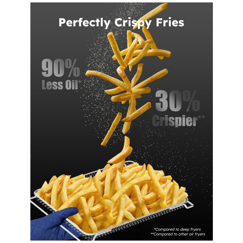 VENTILADOR MAIS RÁPIDO, MELHORES RESULTADOS: O ventilador e a estrutura recém-projetados proporcionam uma velocidade de ventilador 100% mais rápida, garantindo um cozimento mais rápido e resultados irresistivelmente crocantes e dourados.