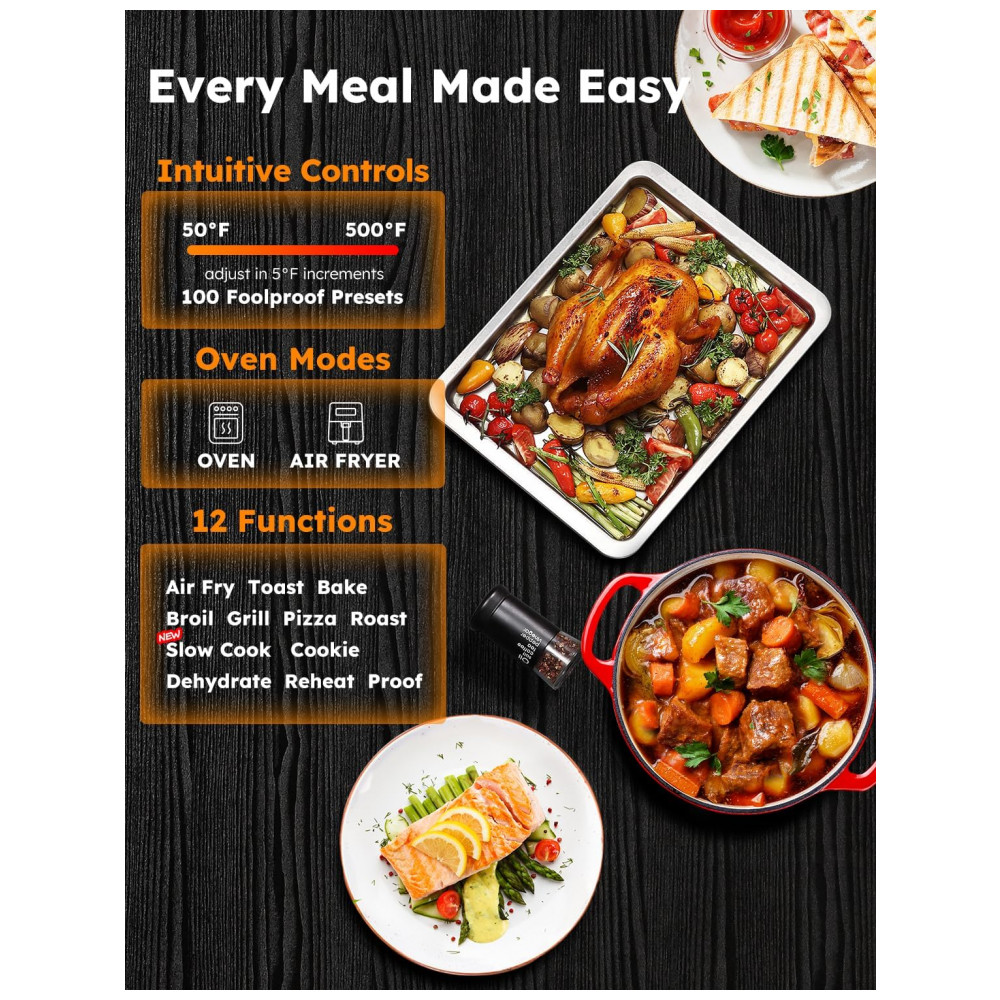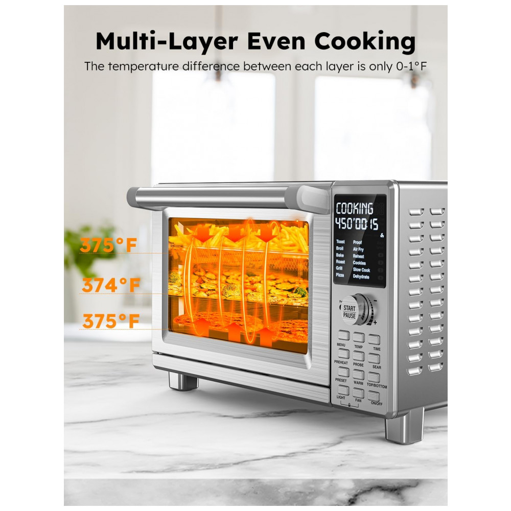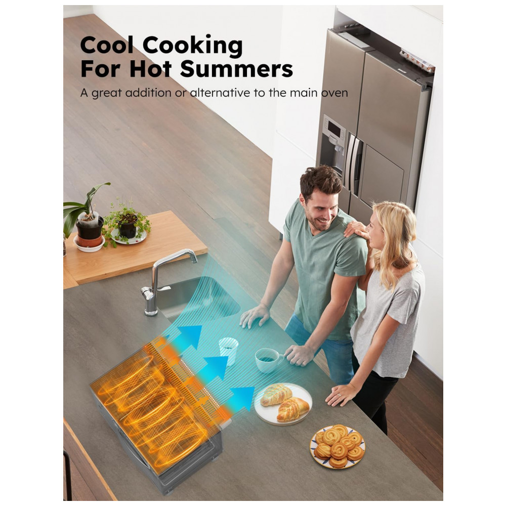 A faixa de temperatura de aproximadamente 10 °C a 260 °C é ajustável em incrementos de 5 °C, com três velocidades de ventilador que permitem controlar a intensidade da convecção. O forno oferece 12 funções de cocção, incluindo air fry, tostar, grelhar, assar, dourar, cozinhar lentamente, desidratar e descongelar, além de 100 receitas pré-programadas para acionamento em um toque. O sistema de aquecimento com convecção super-rápida reduz a diferença de temperatura entre as prateleiras para até cerca de 0–1 °C, tornando o uso de várias grades simultâneas mais uniforme e eficiente.