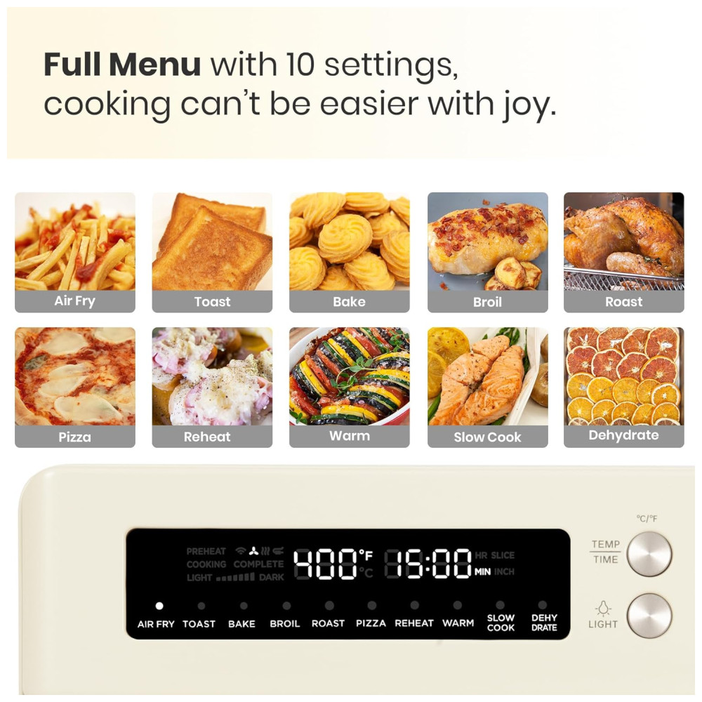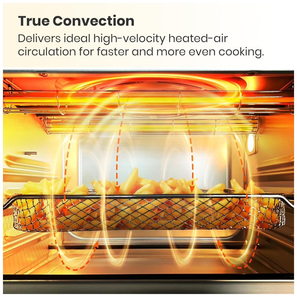 Capacidade Ampla para Refeições e Festas: Com capacidade de 25 litros, o forno comporta um frango de 2,2 a 2,7 kg, 6 fatias de pão, uma porção grande de batatas fritas, 20 asas de frango ou uma pizza de 30 cm. Perfeito para famílias, eventos e preparos em grande quantidade.