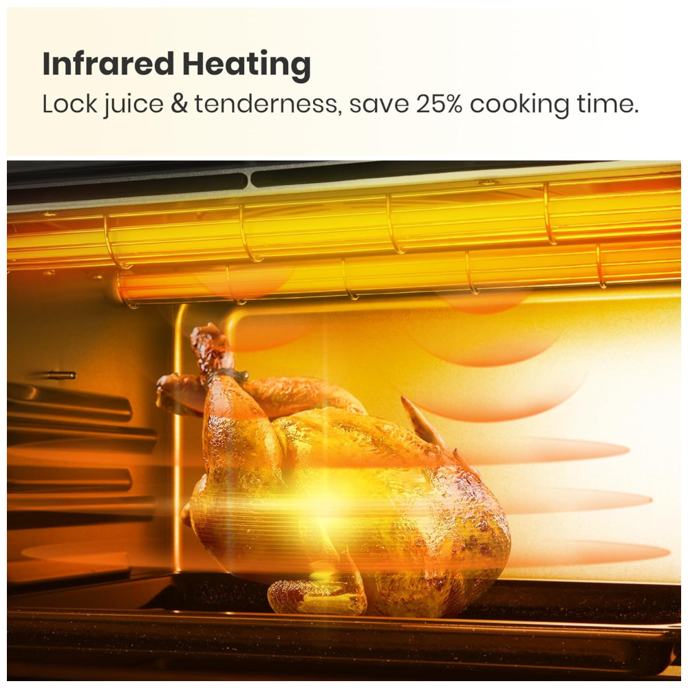 Aquecimento Infravermelho e Convecção Verdadeira: A tecnologia inovadora de aquecimento infravermelho, associada à convecção verdadeira, proporciona cozimento rápido e uniforme, formando uma crosta dourada e crocante enquanto preserva a suculência interna dos alimentos.