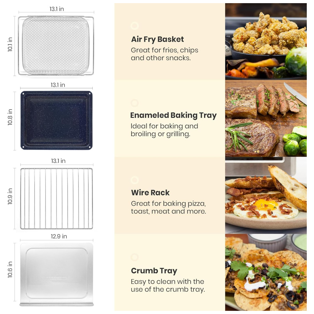 Acessórios Inclusos: Livro de Receitas Premium, Bandeja de Migalhas, Grelha, Cesta para Air Fryer, Bandeja de Assar Esmaltada (livre de PTFE/PFOA).