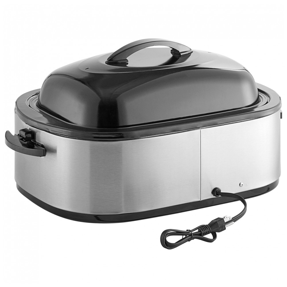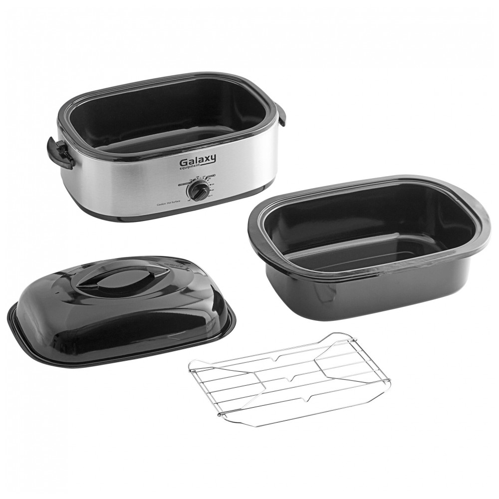 O forno elétrico roaster Galaxy GCR18 é um equipamento multifuncional de bancada para assar frangos, aquecer assados e manter alimentos quentes, com capacidade de 17 L para itens grandes como peru de até 11 kg. Possui controle termostático ajustável de 66°C a 232°C, tampa abaulada de alta resistência que retém calor e umidade, e grade interna com alças para remoção segura de cargas pesadas. Construído em aço inoxidável com bandeja removível de esmalte duplo para limpeza simplificada.