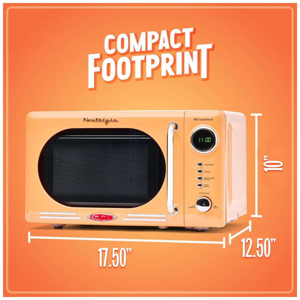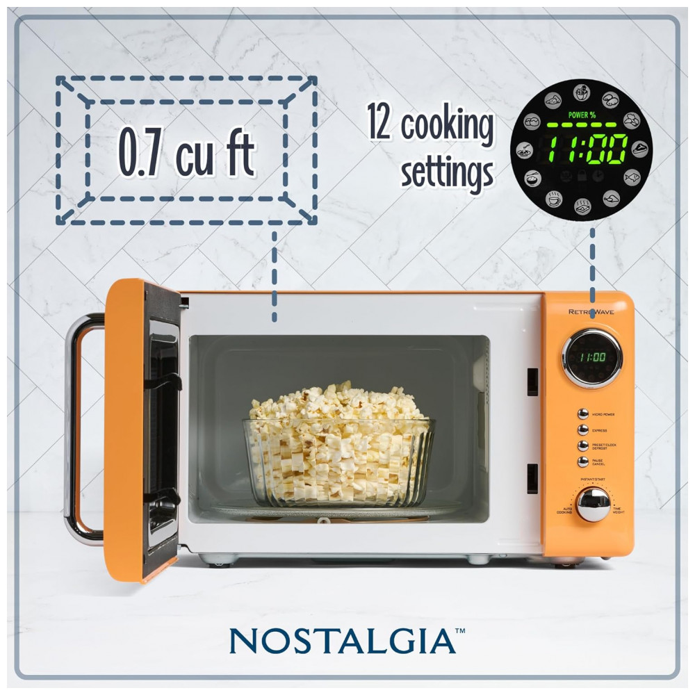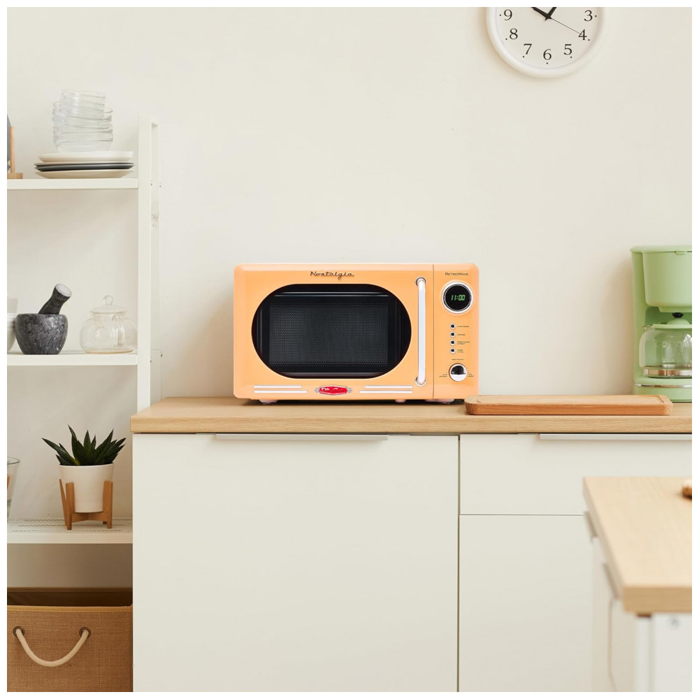 Forno micro-ondas de bancada Nostalgia retrô laranja 700W display digital LED 12 programas trava de segurança infantil 20L 110V